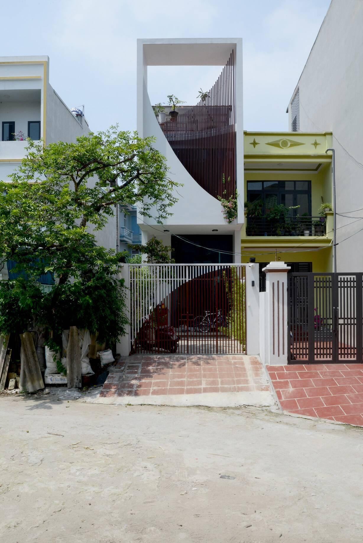 Dùng lam chắn là cách mà công trình 2 tầng này giảm thiểu được tác động trực tiếp của nắng Tây Nam. Bên cạnh đó, lam sắt và mặt tiền được thiết kế với những đường cong và parabol để tạo được sự uyển chuyển, mềm mại cho công trình.