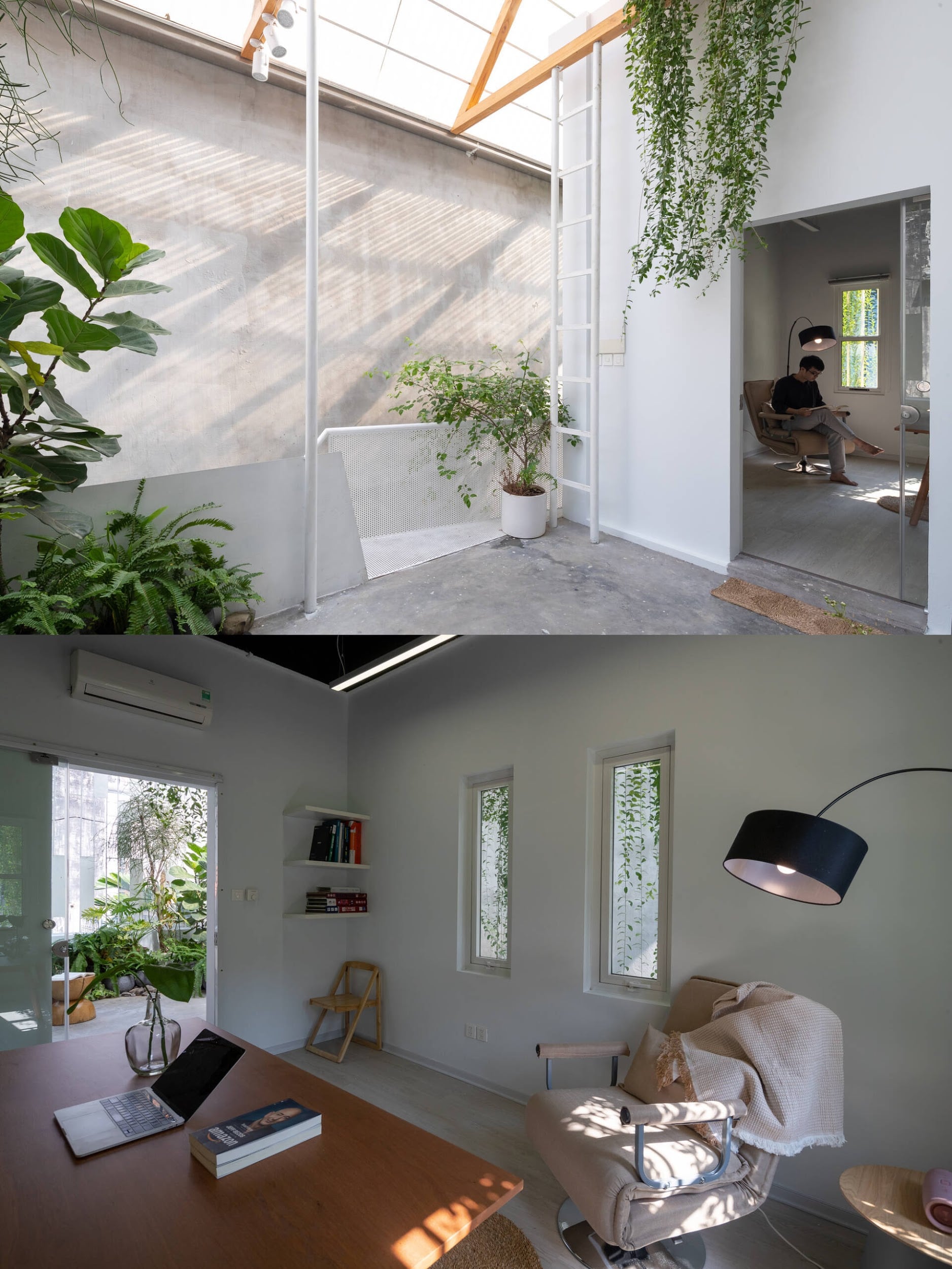 Trái ngược với vẻ đóng kín của mặt tiền, không gian sống trong nhà lại ngập tràn ánh sáng và cây xanh. Điểm đặc trưng của ngôi nhà này chính là họa tiết thép lưới của cầu thang, kết hợp với giếng trời để tạo nên một bữa tiệc ánh sáng đầy nghệ thuật.