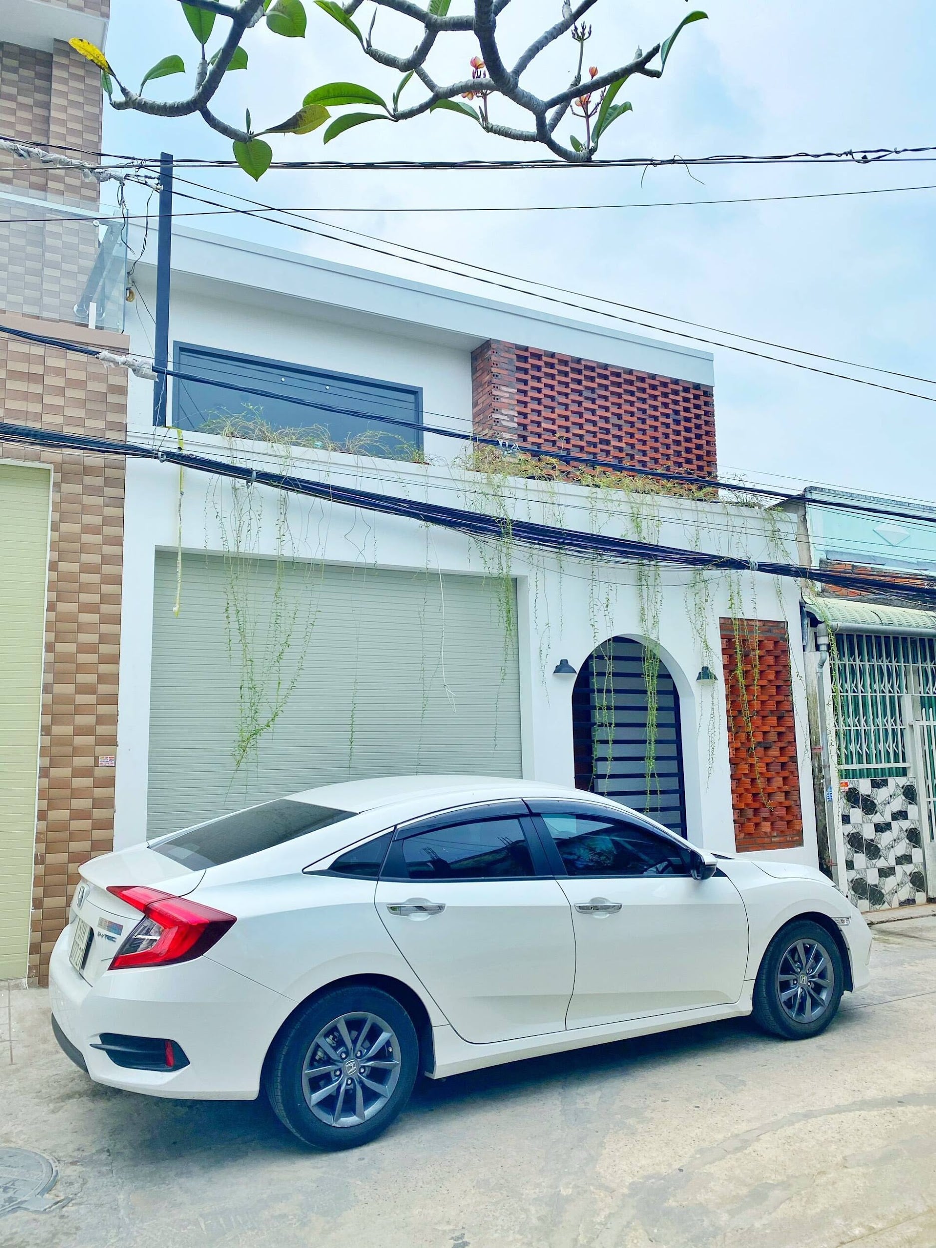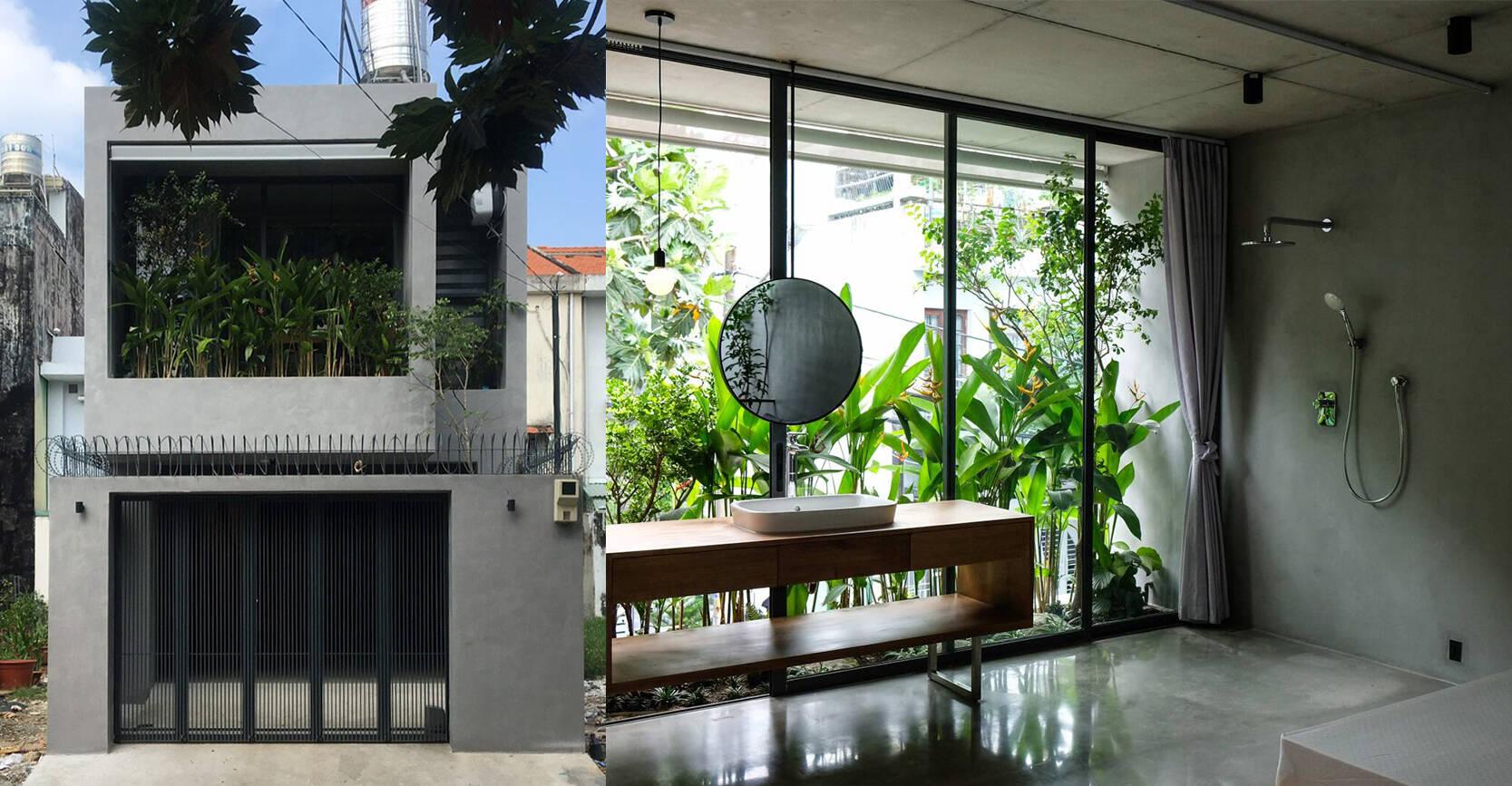 Khác với những ngôi nhà xây kín mặt tiền để tránh nắng hướng Tây, ngôi nhà ống 2 tầng này chắn nắng với một cách khác biệt với hệ cây xanh trước nhà.