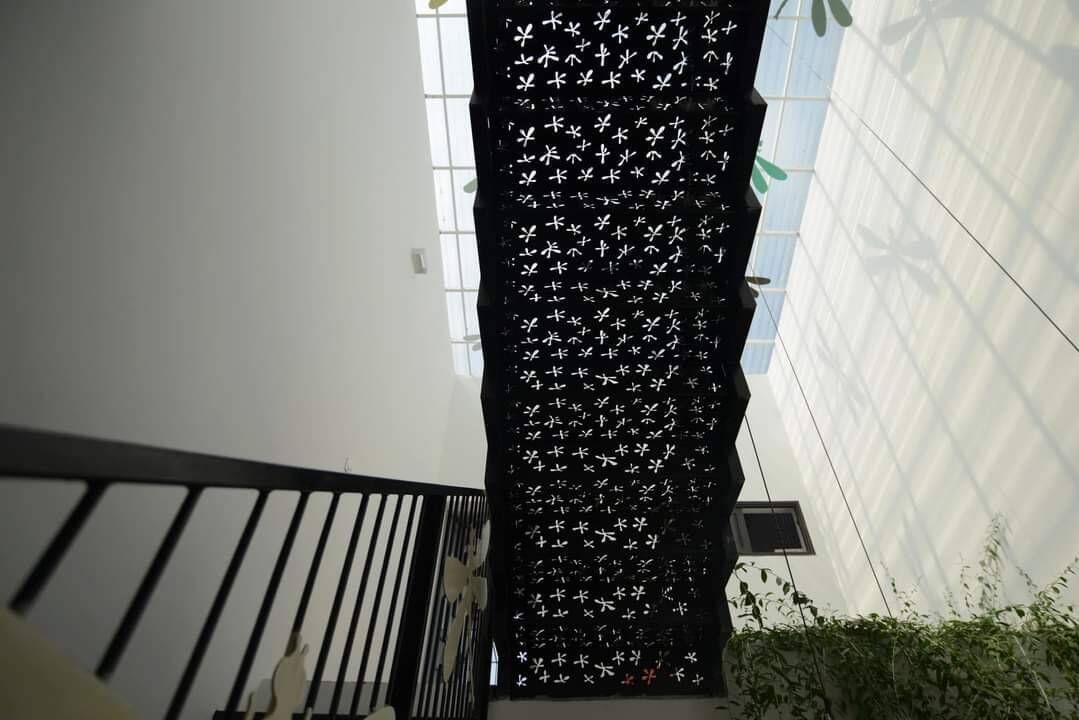 Đầu tiên, mở một hàng lang bên hông nhà để tạo khe thoáng. Hành lang nhỏ với chiều rộng khoảng 1m là trục giao thông chính của ngôi nhà, nơi kết nối giữa hai tầng lầu và giúp gia chủ dễ dàng đi lại giữa các khu vực nhà. Cầu thang với kết cấu sắt lưới có nhiệm vụ luân chuyển ánh sáng và không khí lấy từ giếng trời phân bổ cho không gian sinh hoạt bên dưới.
