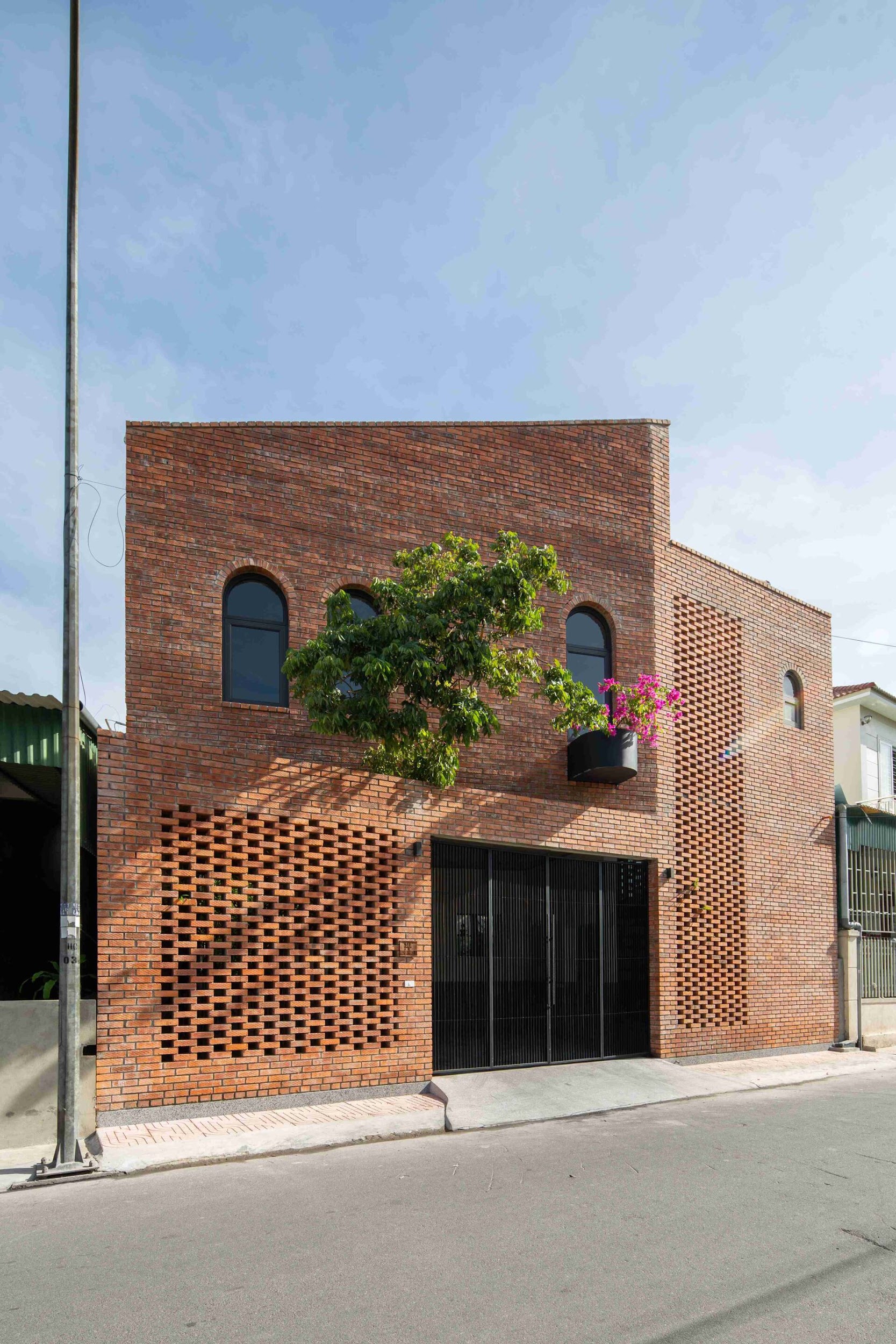 Xuyên suốt ngôi nhà 2 tầng này là hệ thống thông gió thụ động được kết hợp từ nhiều giải pháp sáng tạo. Thông gió mặt tiền với cửa song sắt và bức tường gạch hoa gió được xếp từ gạch đất nung. Thông gió trong nhà được tạo nên từ gạch bông gió và những ô cửa vòm đối lưu không khí.