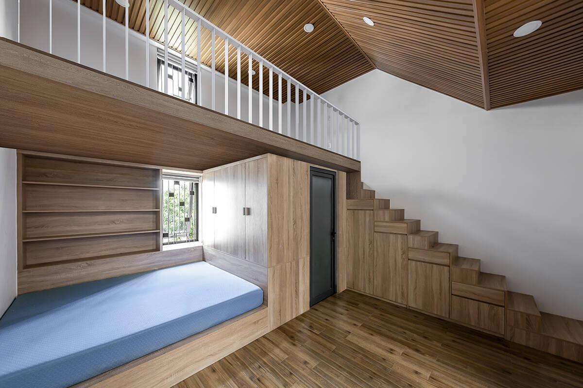 Thay vì xây 3 phòng ngủ và bắt buộc phải xây lên tầng 3, cặp vợ chồng ở TP.HCM đã tiết kiệm được chi phí xây dựng với 1 phòng ngủ master và 1 phòng ngủ duplex trong một không gian sáng sủa, thoáng đãng và tương đối tối giản.