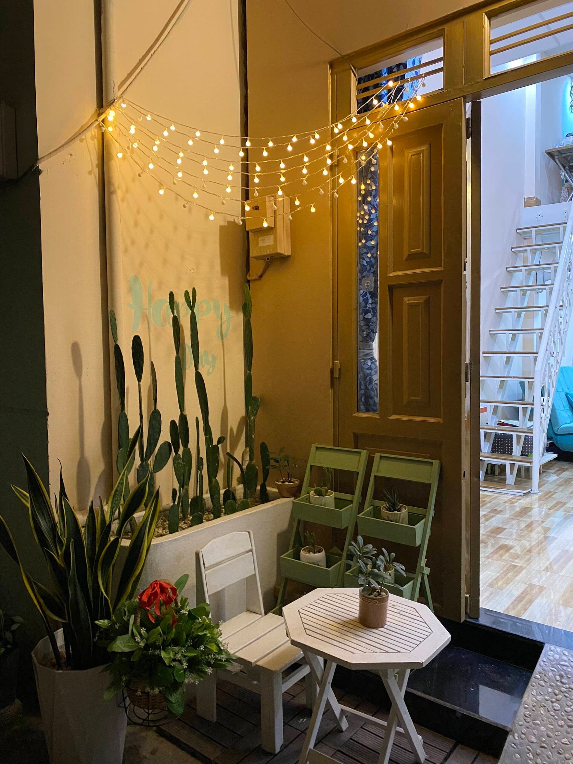 Ngoài sân, chị Ngọc muốn làm hơi hướng Địa Trung Hải nên xây bồn cao trồng xương rồng với trồng cây bàng Sing, cùng với đó là bộ bàn ghế để thưởng trà cho mẹ