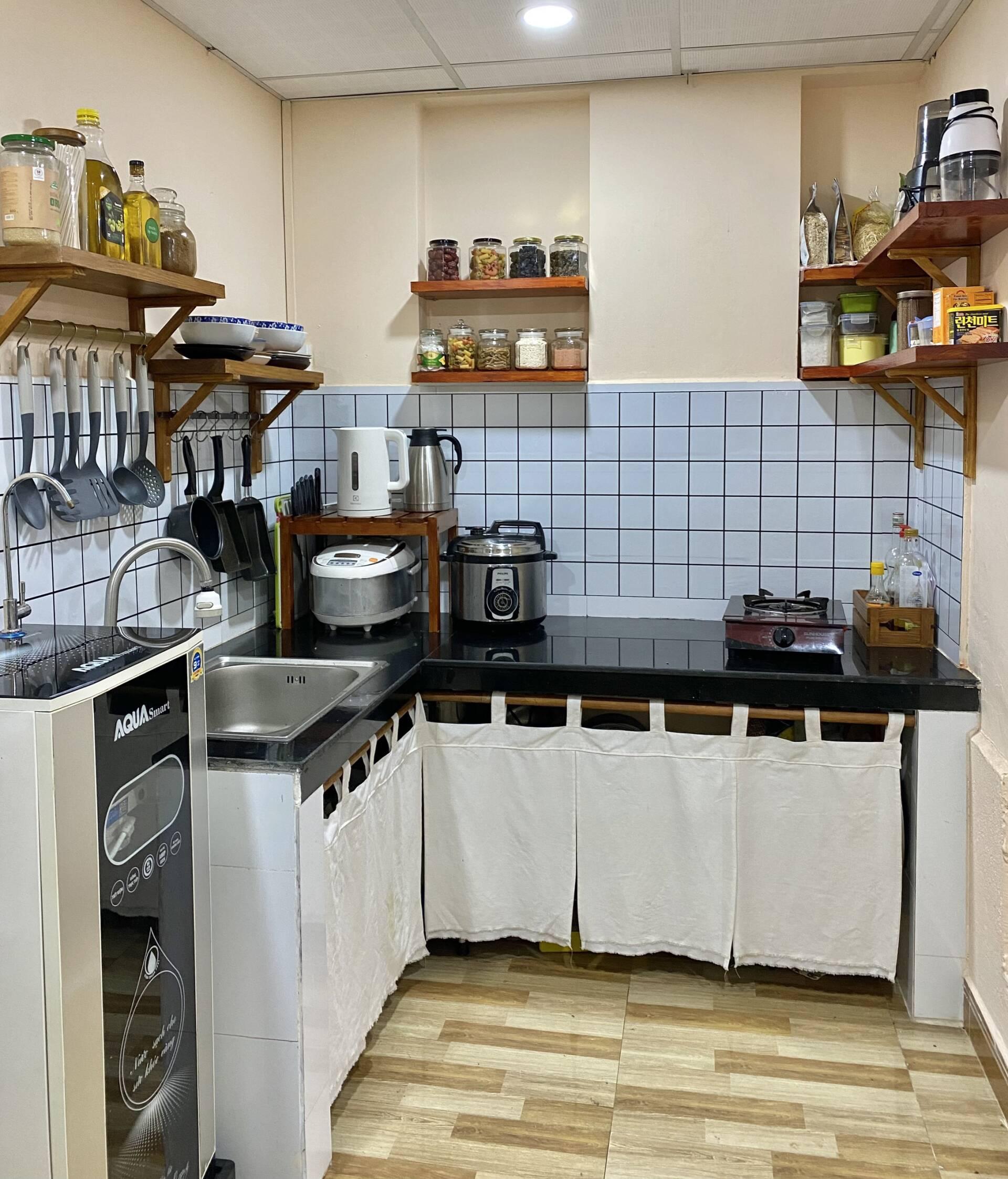 Sau này chị Ngọc tìm được decal màu trắng nên đã thay đổi toàn bộ bếp. Do diện tích bếp quá bé không thể đóng tủ, chị Ngọc đã mua các thanh gỗ về sơn và nhờ chú hàng xóm đóng hộ lên, tự tay may rèm che theo phong cách Nhật