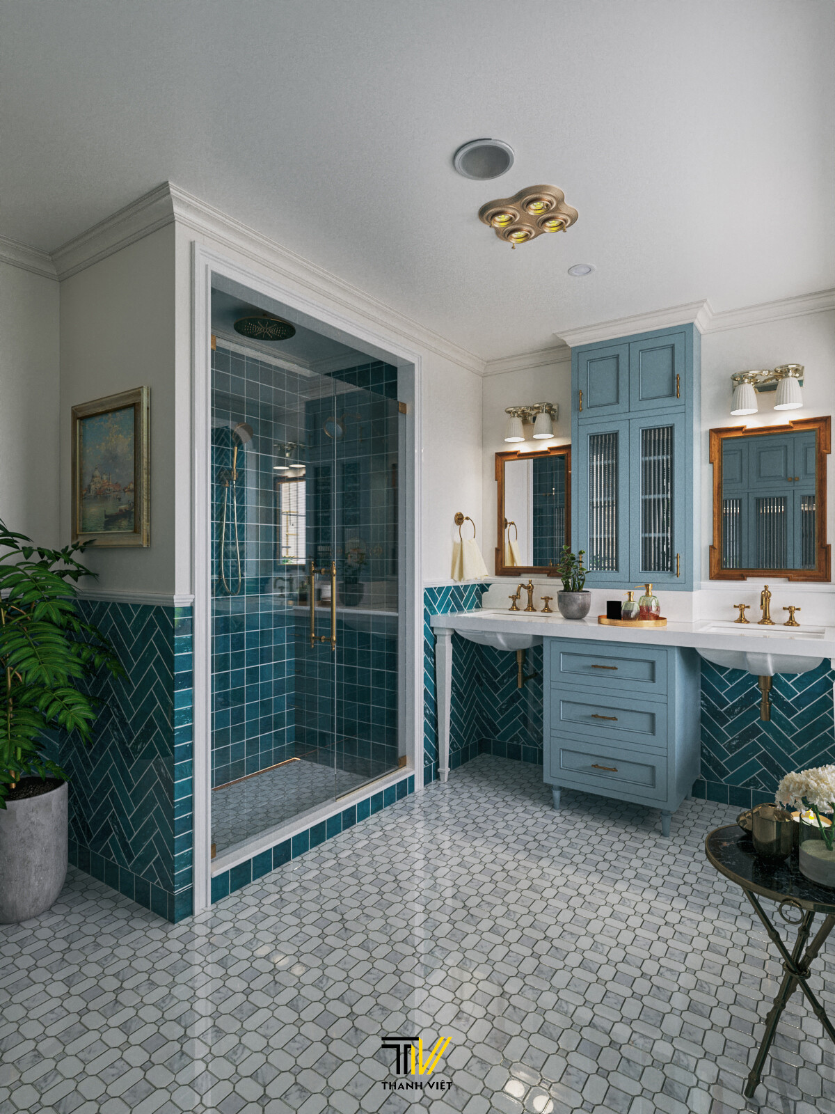 - Phòng tắm: Trải nghiệm cảm giác mát mẻ của những bờ biển cát trắng - nắng vàng ngay tại gia với màu xanh chủ đạo trong thiết kế nội thất phòng tắm.