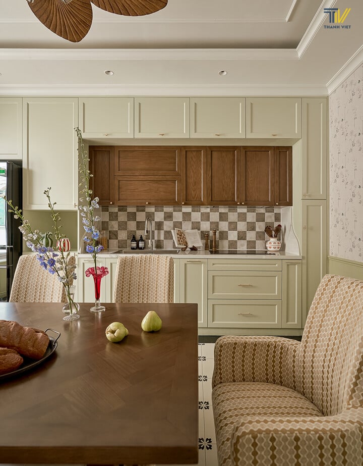 Căn bếp công nghiệp được phủ một màu xanh tươi mát, nơi được nữ gia chủ yêu thích nhất nhà