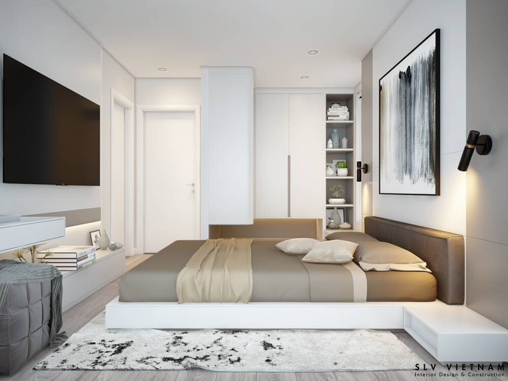 Phòng ngủ chính với thiết kế đơn giản, cùng với những gam màu trung tính. Màu trắng là gam màu chủ đạo và điểm nhấn là các màu trung tính nhẹ nhàng. Phòng ngủ chính được bố trí những đồ nội thất cơ bản, thiết kế tối giản. Điểm nhấn căn phòng là bức tranh trừu tượng ở đầu giường và các ô cửa kính rất lớn. Làm cho căn phòng luôn tràn ngập ánh sáng, thoáng đãng.