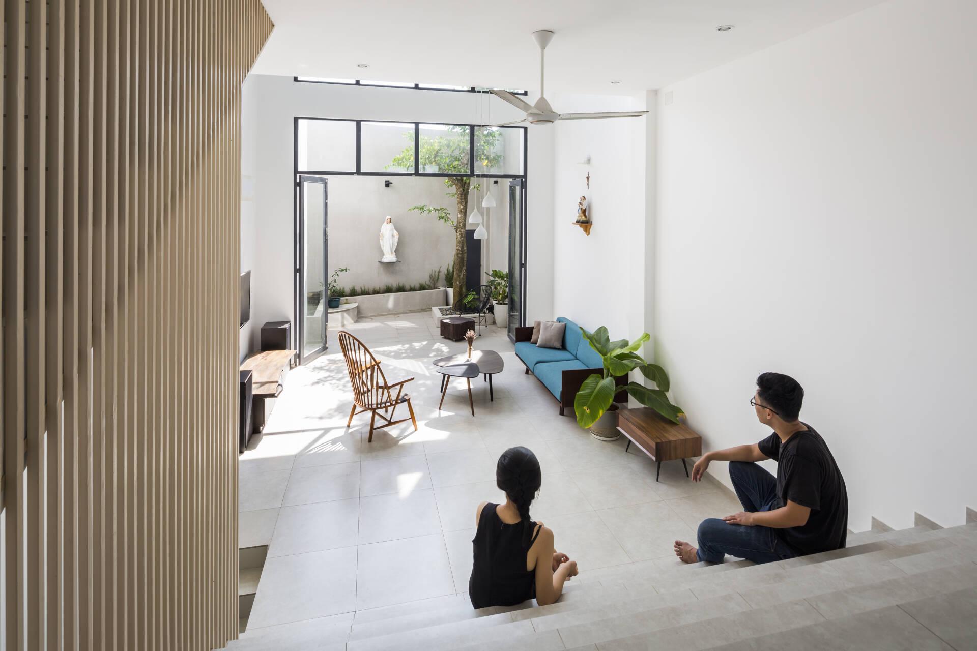 Phòng khách nằm ở tầng lửng, được đẩy về cuối ngôi nhà ống, tách biệt với gara để ô tô