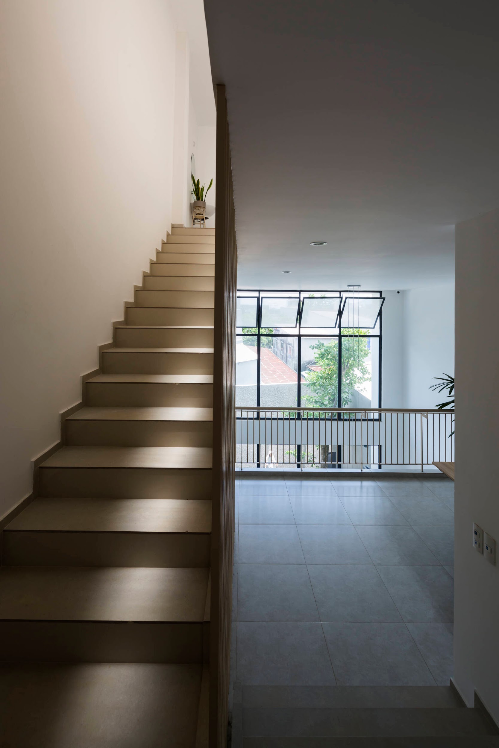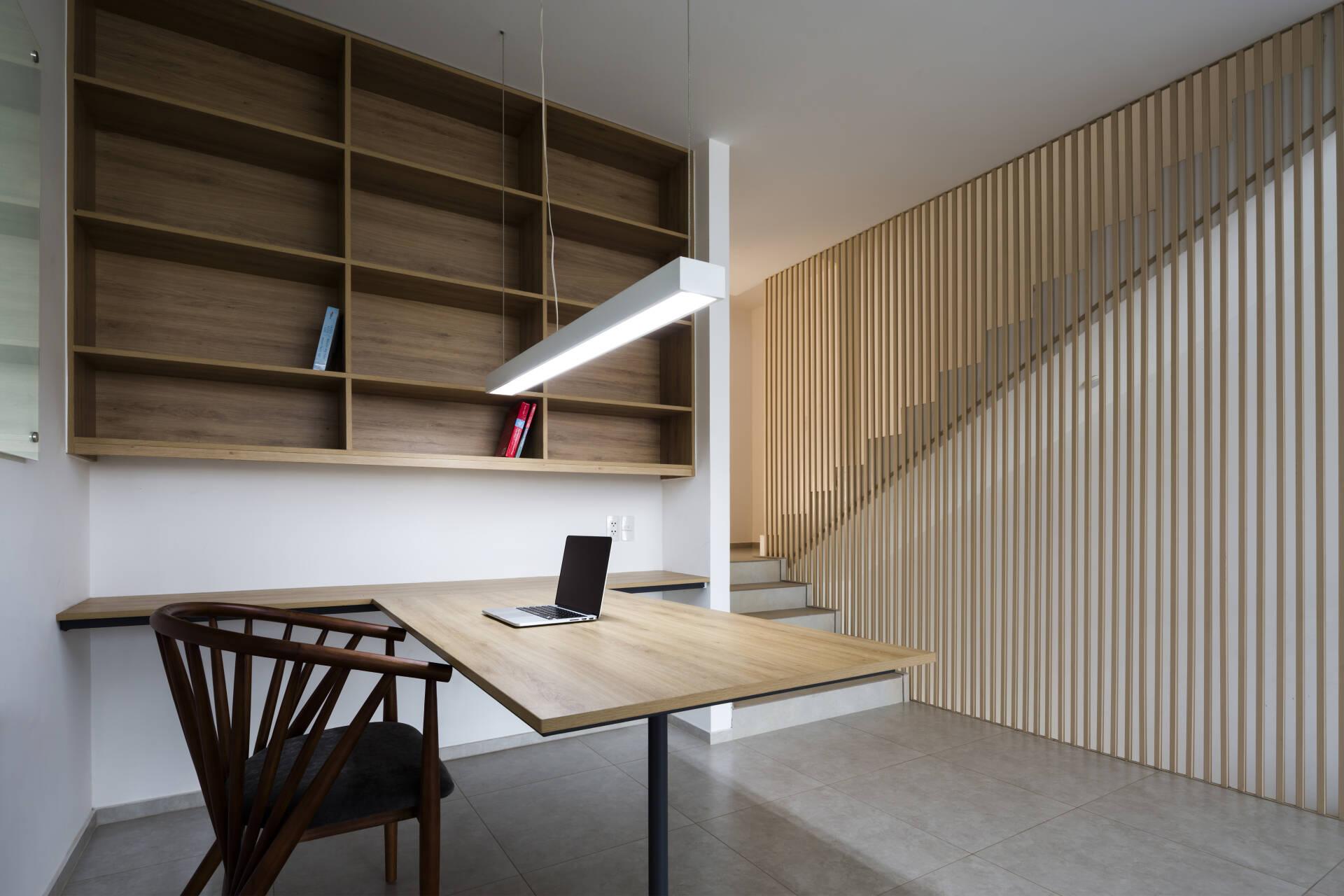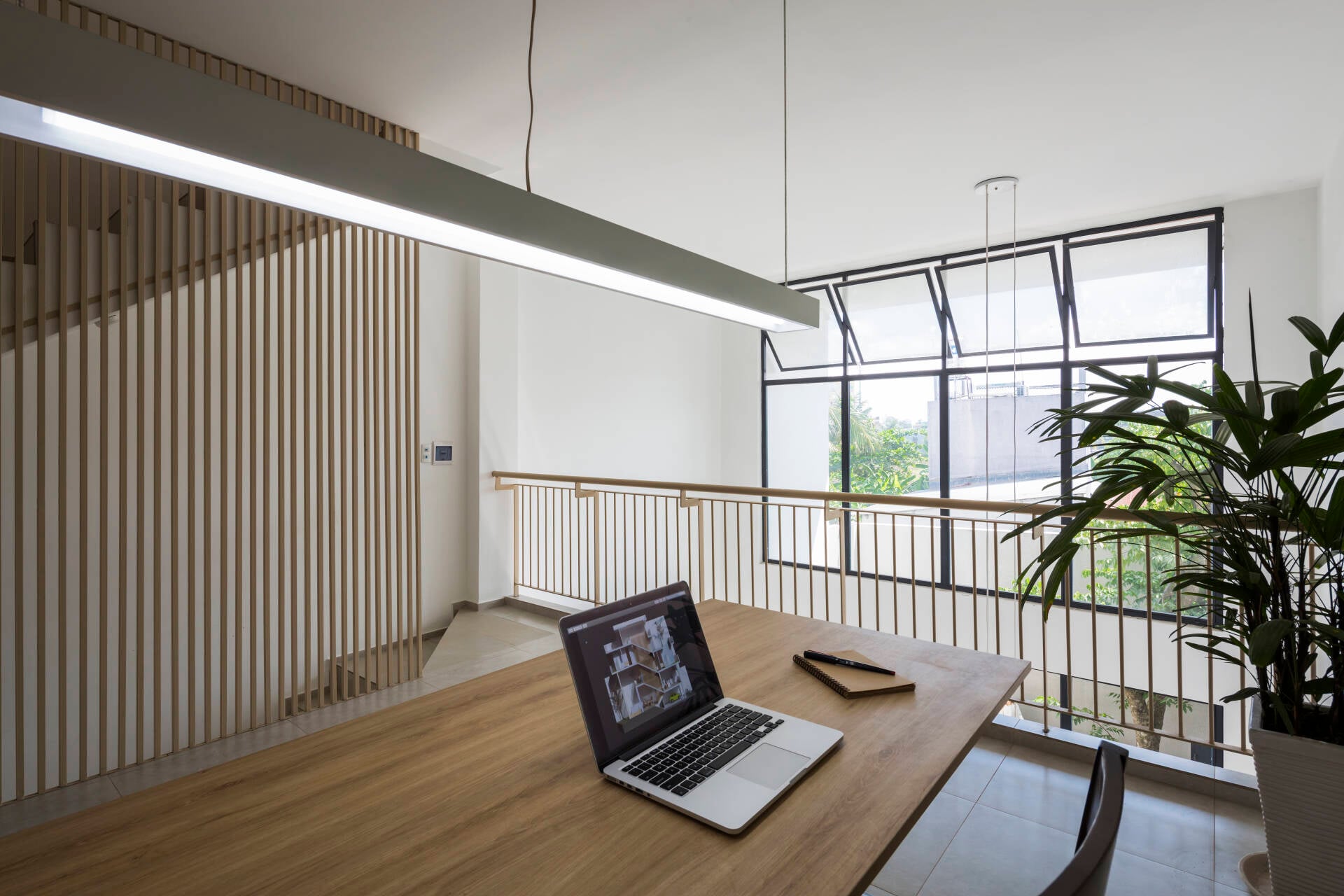 Vị trí của phòng làm việc nằm ở lầu 1 cũng quay vào sân sau, “giao tiếp” với phòng khách bên dưới thông qua khoảng thông tầng rộng. Sự sắp đặt các không gian chính của ngôi nhà một cách có chủ đích theo tác động của mặt trời giúp cho không khí bên trong trở nên mát mẻ vì đón nắng sáng và gió mát từ phía Đông.