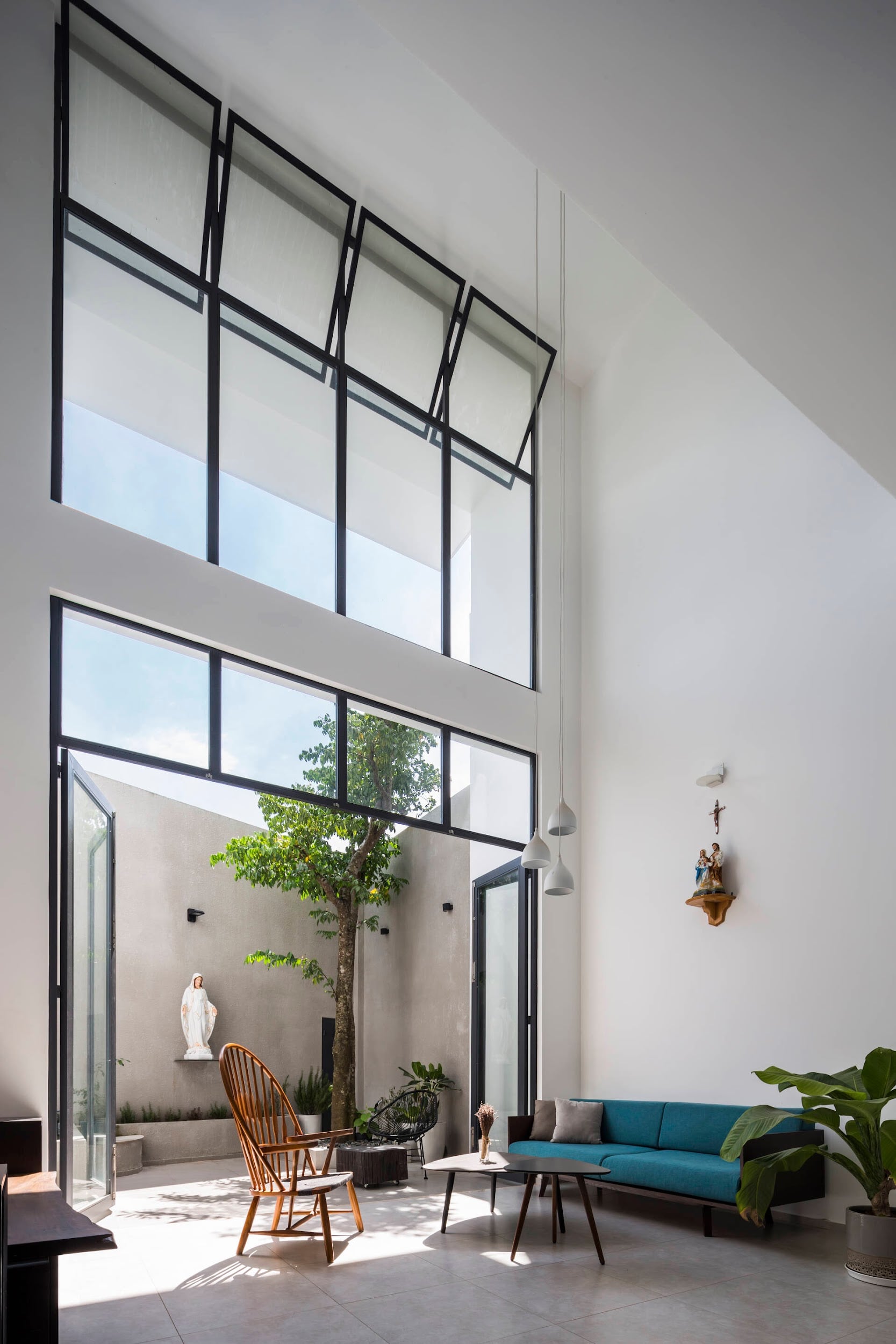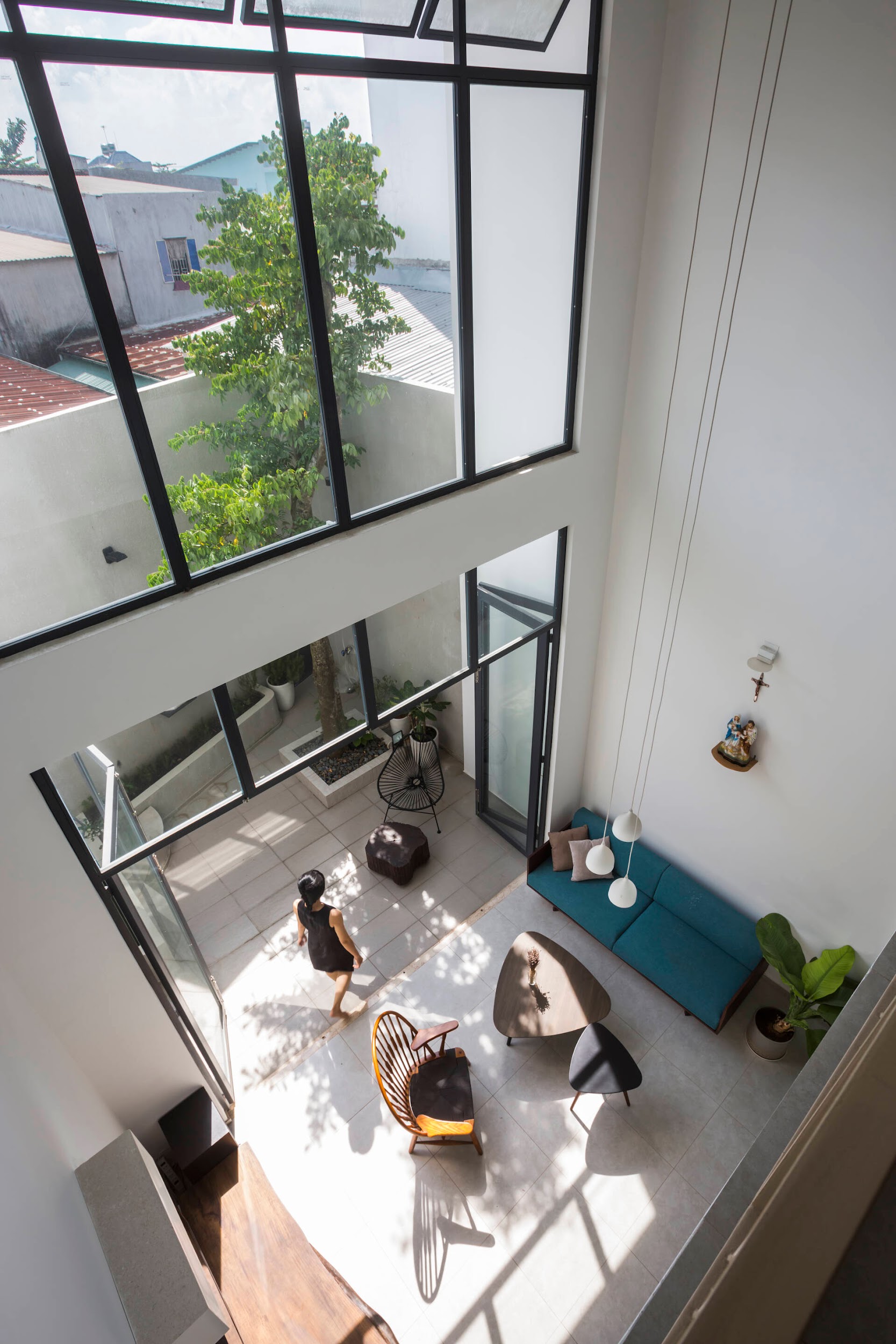 Để tối ưu ánh sáng và gió tươi, KTS đã sử dụng hệ cửa vách kính sát trần
