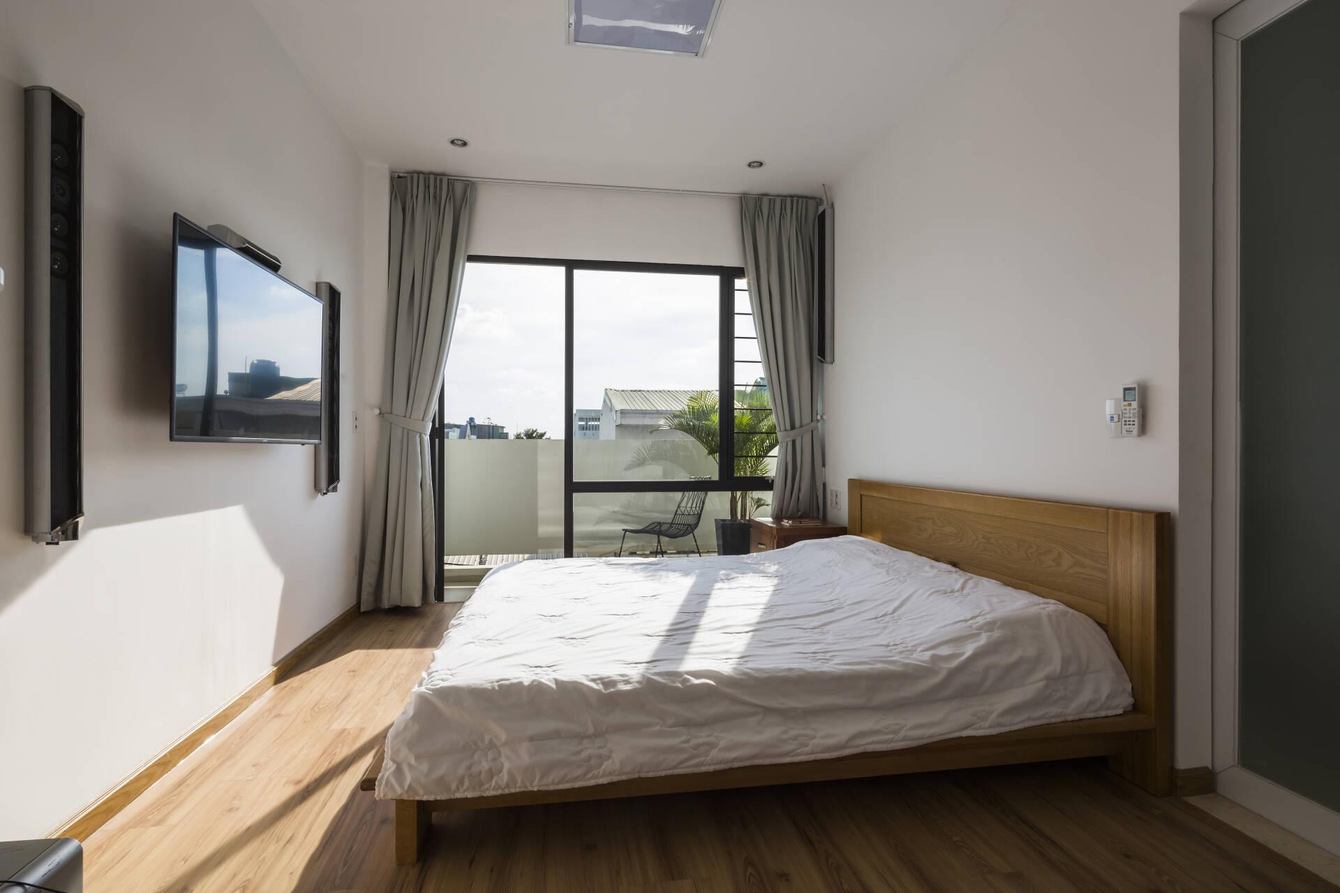 Phòng ngủ master với vệ sinh khép kín, ngập tràn nắng hướng Tây. KTS đã sử dụng ban công làm khoảng đệm, đồng thời cửa kính và rèm che cũng điều tiết ánh sáng hiệu quả