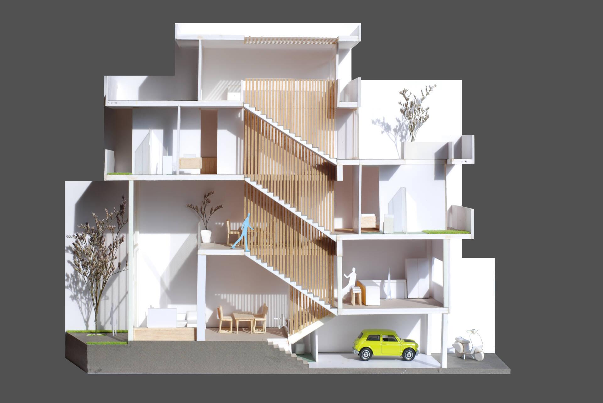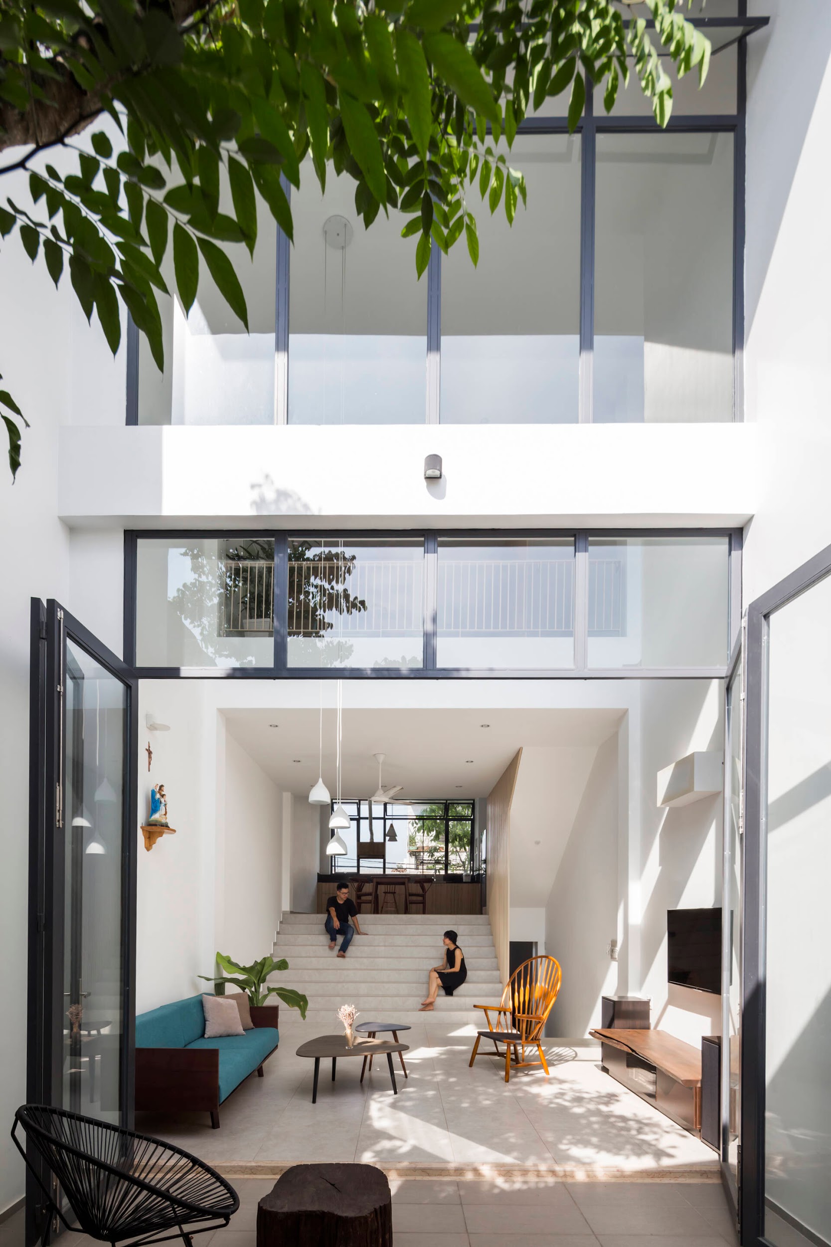 Mọi không gian chức năng bên trong nhà ống được thiết kế mở và bố trí theo hướng lệch tầng. Chúng được xâu chuỗi lại bằng khoảng thông tầng ở phòng khách và thang, sân trước và sau. Điều này không những làm cho sự liên kết và điểm nhìn về mặt không gian trở nên hấp dẫn hơn, mà còn đảm bảo môi trường bên trong tiện nghi tốt hơn. Ánh sáng tự nhiên có thể đi vào các gian phòng qua các lỗ mở trên 2 mặt tiền nhà và khoảng mở đứng.