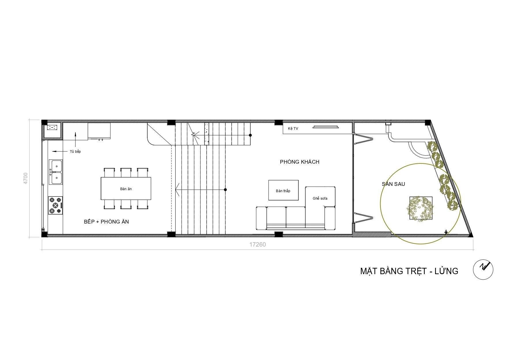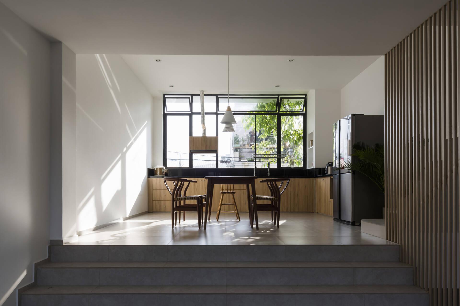 Khu vực phòng khách và sinh hoạt chính của gia đình được đặt ở phía sau ngôi nhà ống, quay về hướng Đông và có khoảng sân sau như một khoảng xanh quý giá và vùng đệm tuyệt vời để điều tiết môi trường. Trong khi đó, nhà xe ở tầng trệt và bếp ở lầu 1 được sắp xếp về hướng Tây. Không gian phòng ăn cũng quay về hướng đông, nối kết mở một cách thú vị qua phòng khách, sau đó ra sân sau.