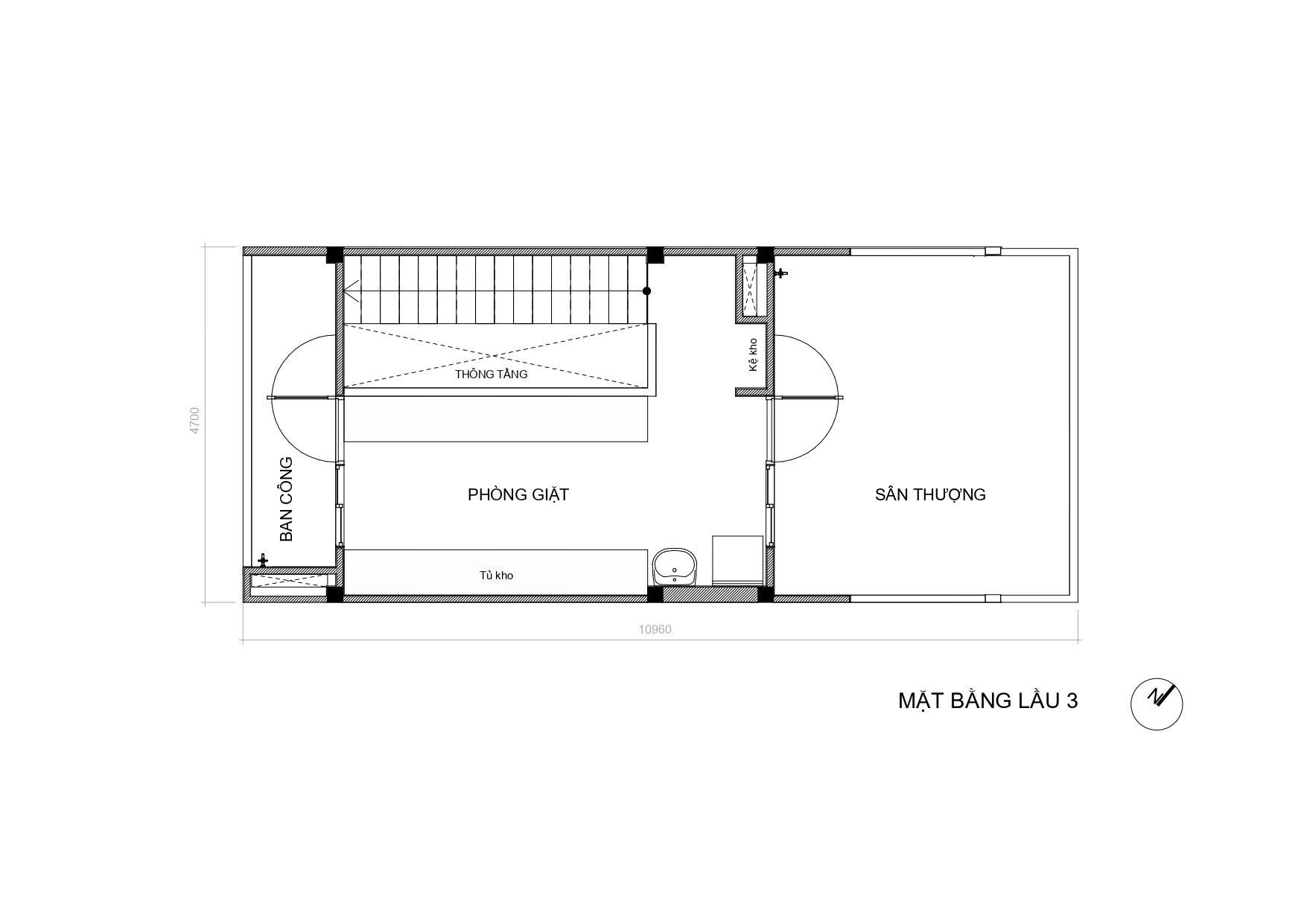 Một điểm đặc biệt nữa là tầng sân thượng được đặt ở lầu 2 (tầng 3) chứ không phải tầng cao nhất. Tầng cao nhất sẽ được bố trí các không gian có tần suất sử dụng thấp như nhà kho, khu giặt phơi. Nhờ đó mà các thành viên trong gia đình có thể tiếp cận không gian sân thượng để sinh hoạt một cách dễ dàng, thuận tiện hơn.