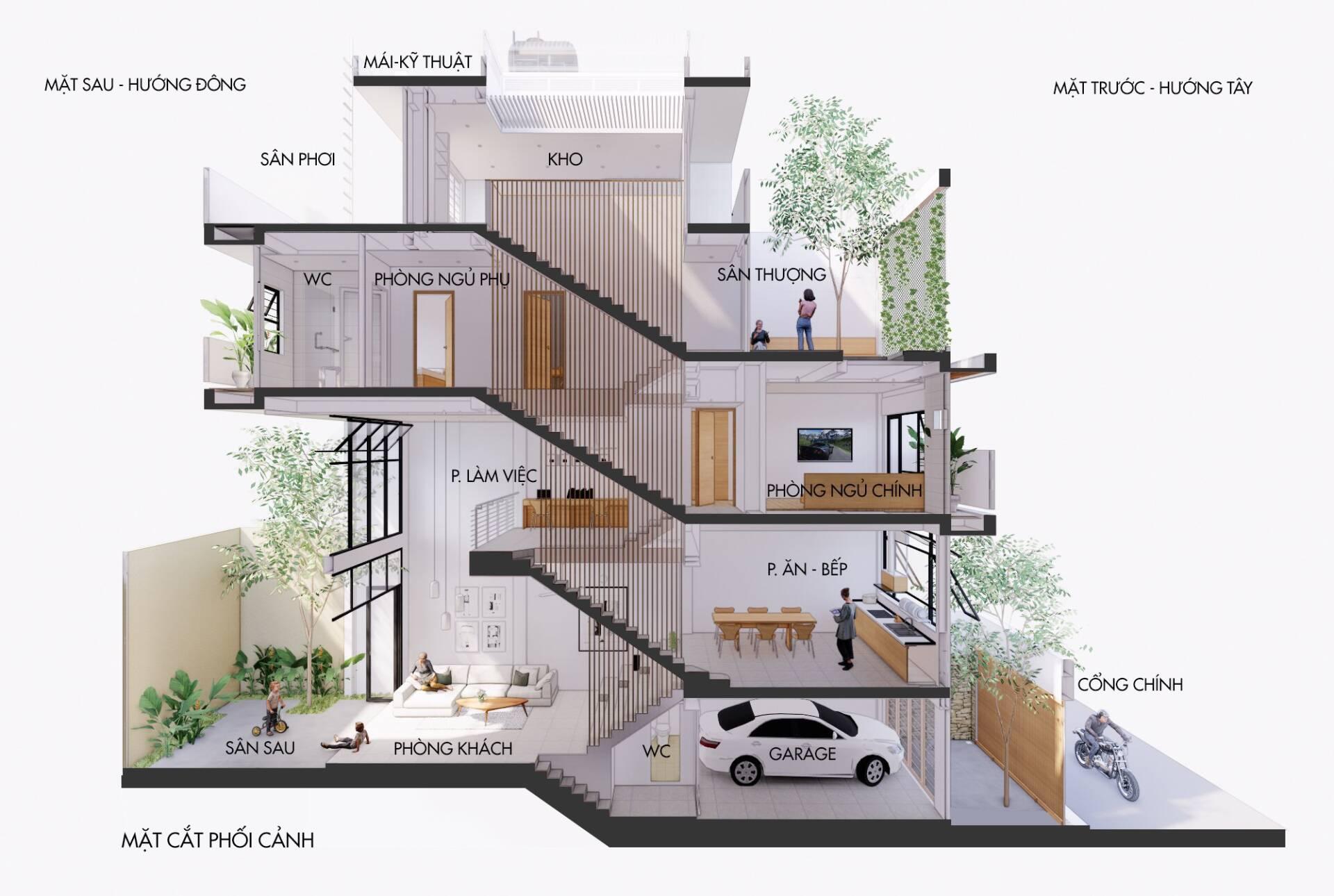 Mặt cắt phối cảnh của nhà ống - nhà Thủ Đức