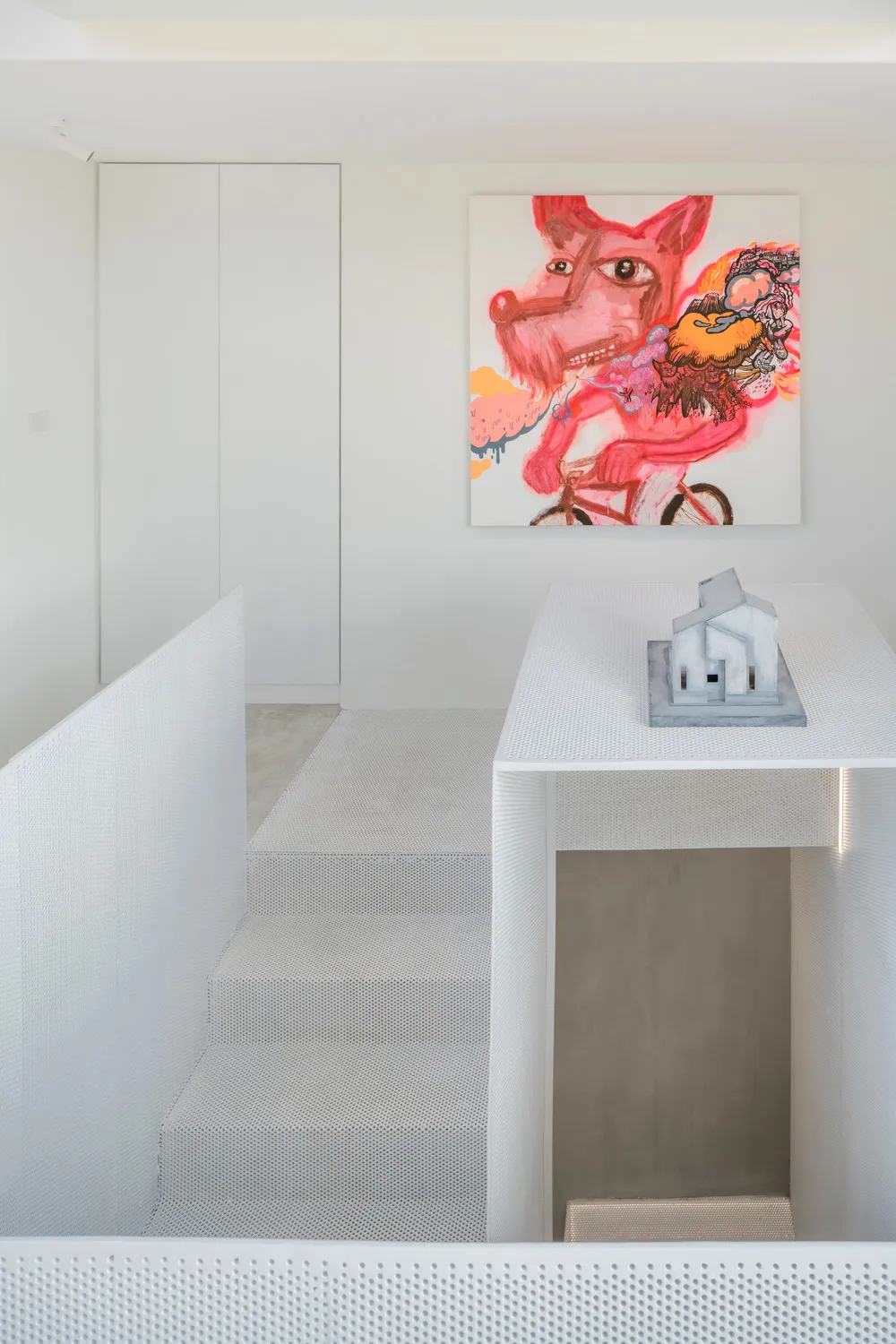 Cầu thang được làm từ những tấm thép đục lỗ tạo nên một thiết kế “lơ lửng” đặc biệt