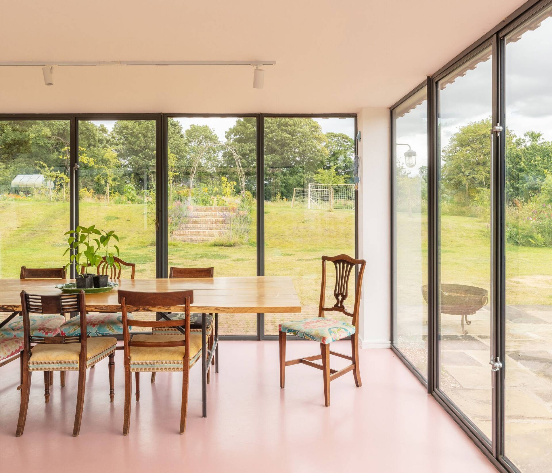 Tầng 1 của khối nhà chính được làm bằng chất liệu kính, mang đến cho Beck Farm & Studio không gian thoáng sáng