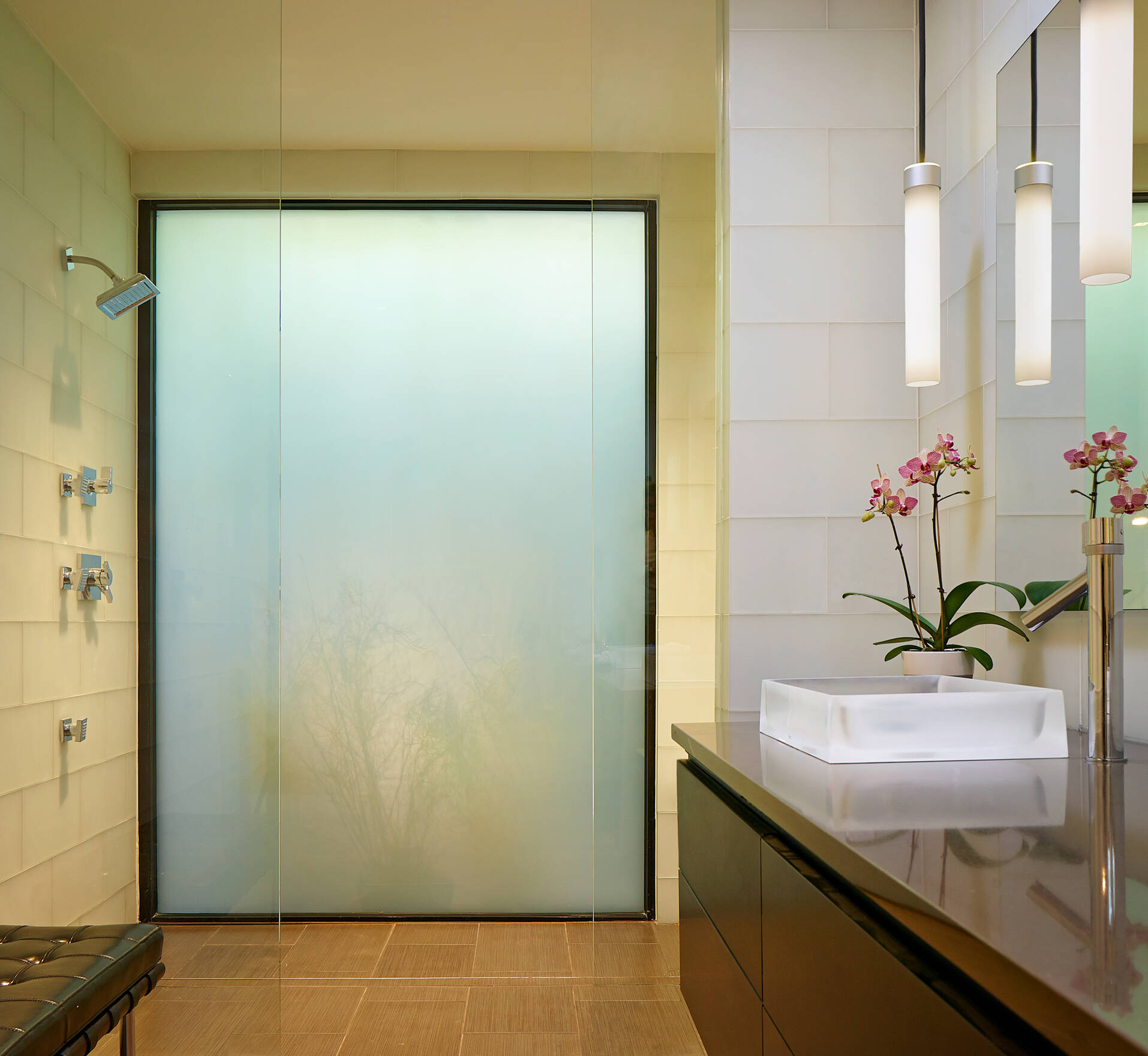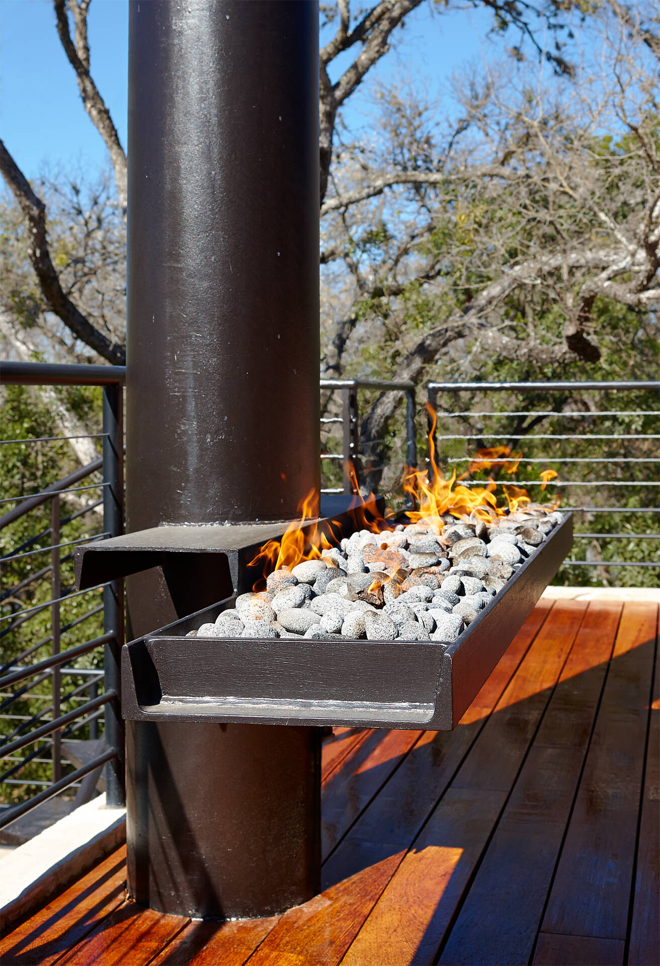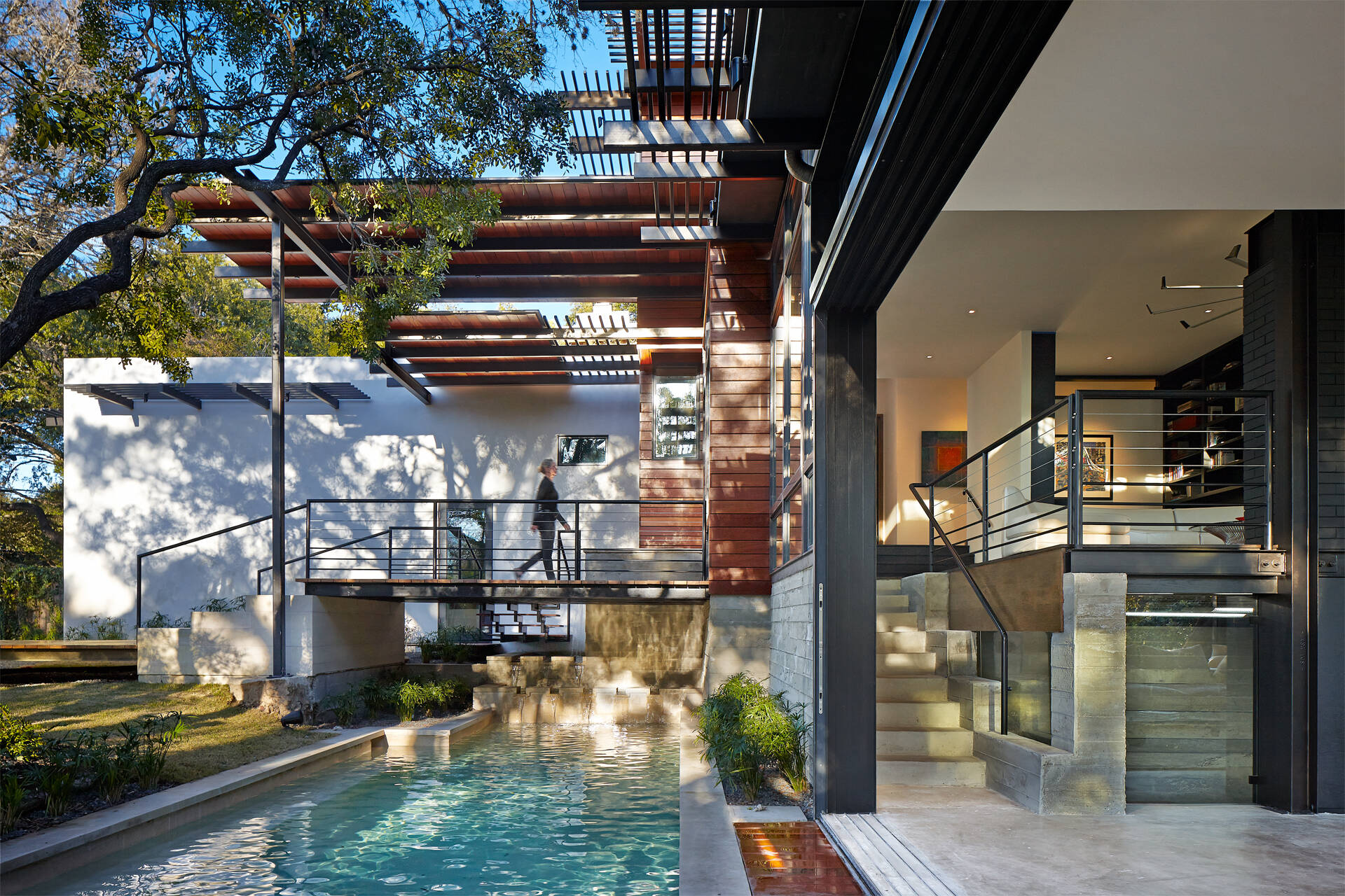 Để vào trong nhà thì sẽ đi qua hồ bơi và một chiếc cầu, dẫn tới bếp và xuống khu vực phòng khách. Cây cầu ở ngoài hồ bơi, hốc nước và bóng mát từ những cây cổ thụ xung quanh giúp không gian ngoài trời thêm sinh động