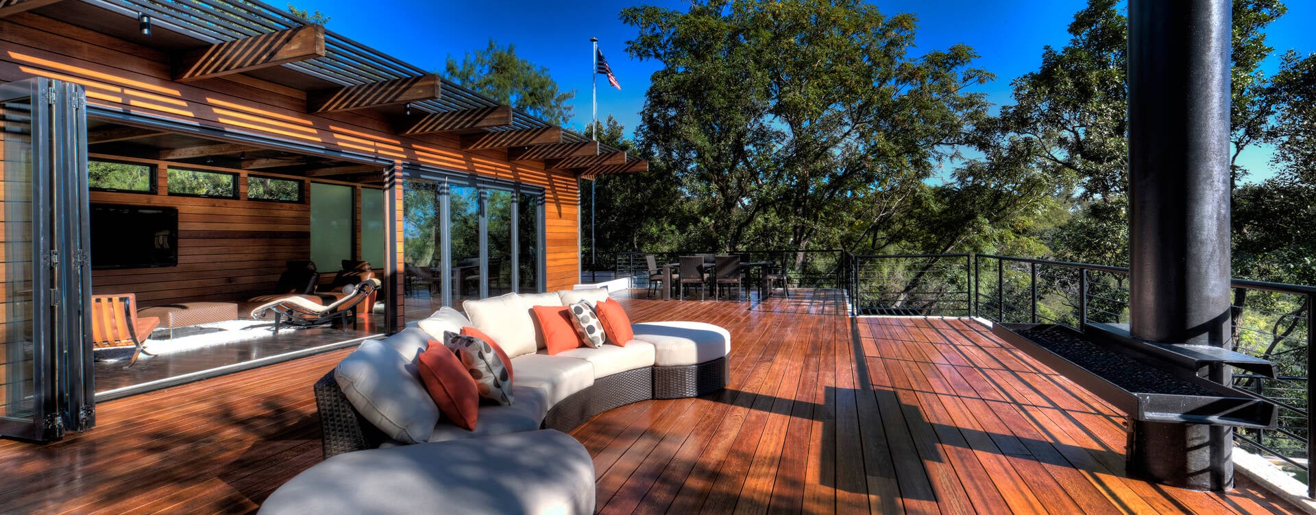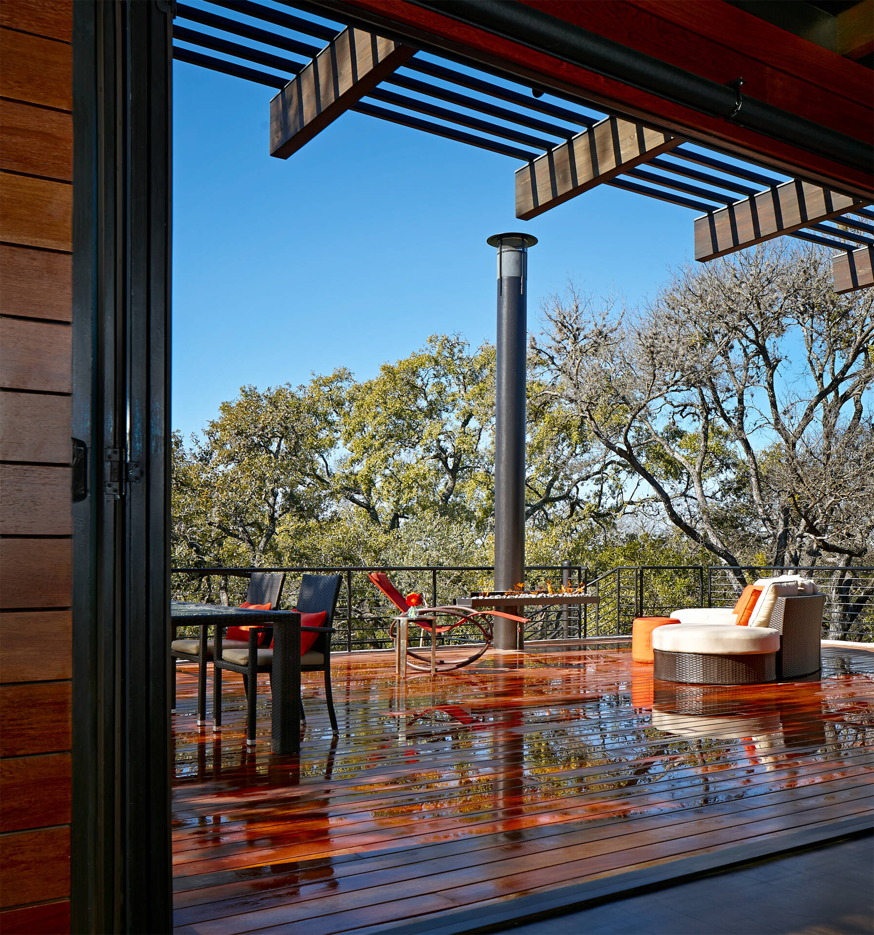 Cách thiết kế này giúp mở rộng không gian ra khoảng sân hiên ngoài trời, nằm dưới các tán cây xanh