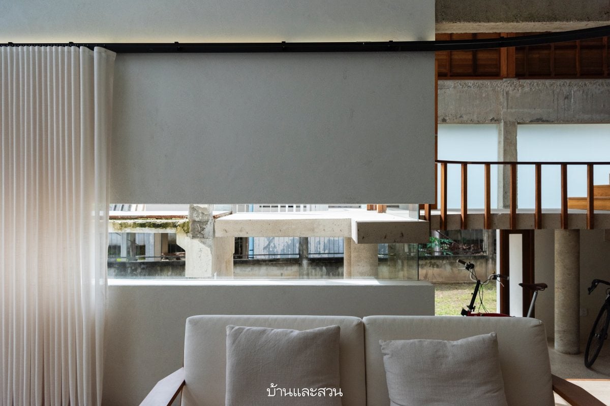 Phòng khách nằm ở cuối nhà, bố trí rèm che để đảm bảo sự riêng tư và điều chỉnh ánh sáng
