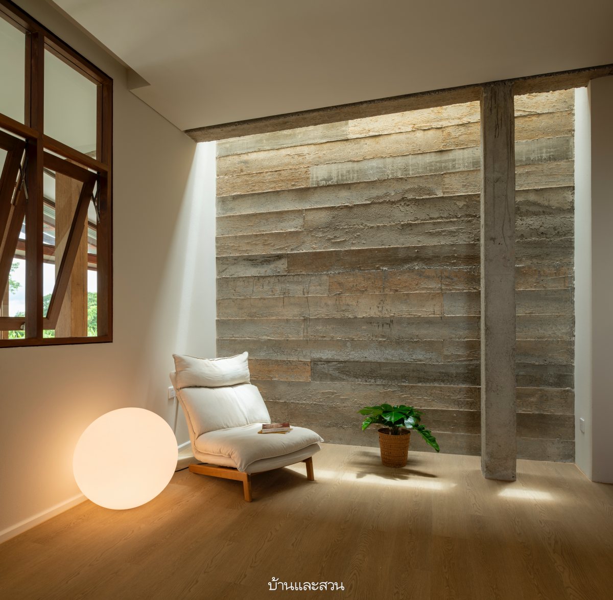 Không gian sinh hoạt chính được nâng cao so với lối đi, sử dụng vật liệu lát sàn khác nhau để nhấn mạnh sự thay đổi