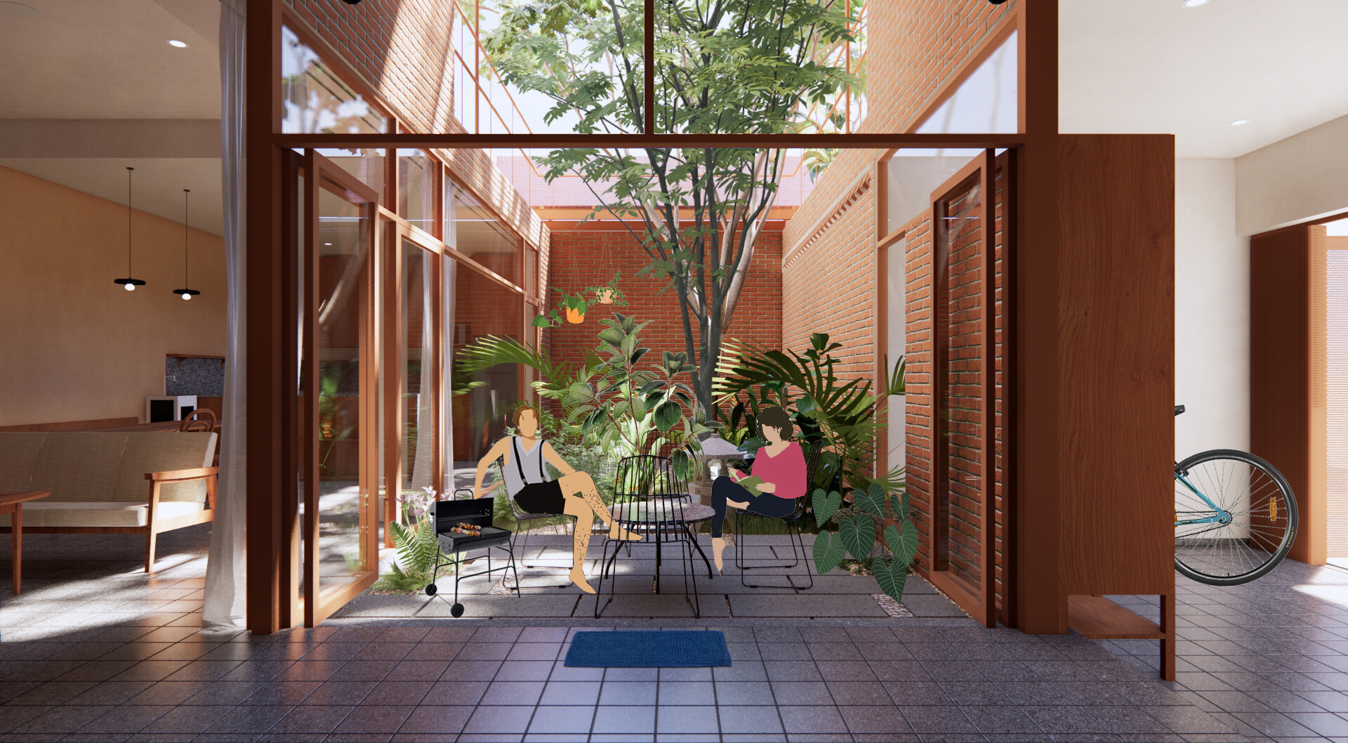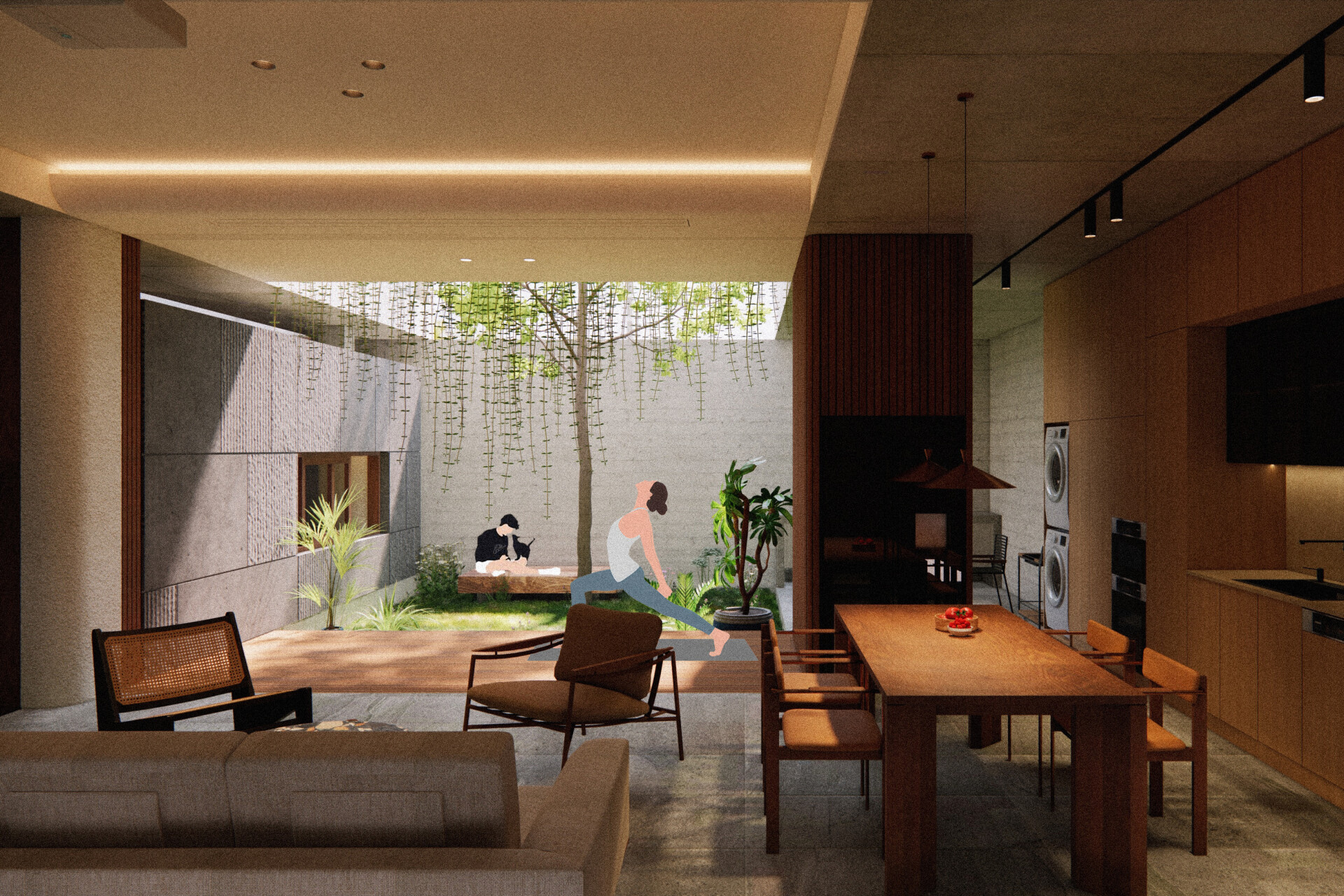 Khoảng sân được bao bọc bởi các không gian sinh hoạt với sự liên kết mạnh mẽ lại càng tốt. Những chiếc cửa luôn mở để có thể tiếp cận dễ dàng, khoảng sân có thể luôn được nhìn thấy hoặc đi ngang qua trong đời sống thường nhật. Lúc đó, không gian ngoài trời này sẽ có cơ hội được sử dụng thường xuyên hơn, phát huy cả vai trò là một “trái tim” điều tiết vi khí hậu cũng như điểm kết nối các không gian trong nhà ở.