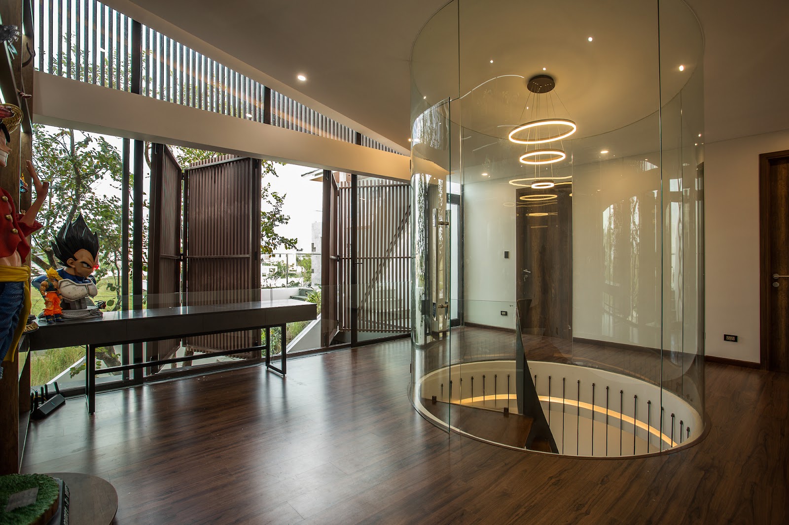 Phòng thờ, phòng làm việc và hai phòng ngủ nữa nằm ở tầng một của House of One Piece và hướng ra khu vườn. Chúng cũng được trang bị cửa sổ trượt để tối đa hóa luồng không khí, đặc biệt là luồng không khí từ biển gần đó. Sự khác biệt giữa tầng một và tầng trệt là, tầng một được trang bị cửa sổ chớp. Điều này giúp giảm ánh sáng mặt trời khi cần thiết.