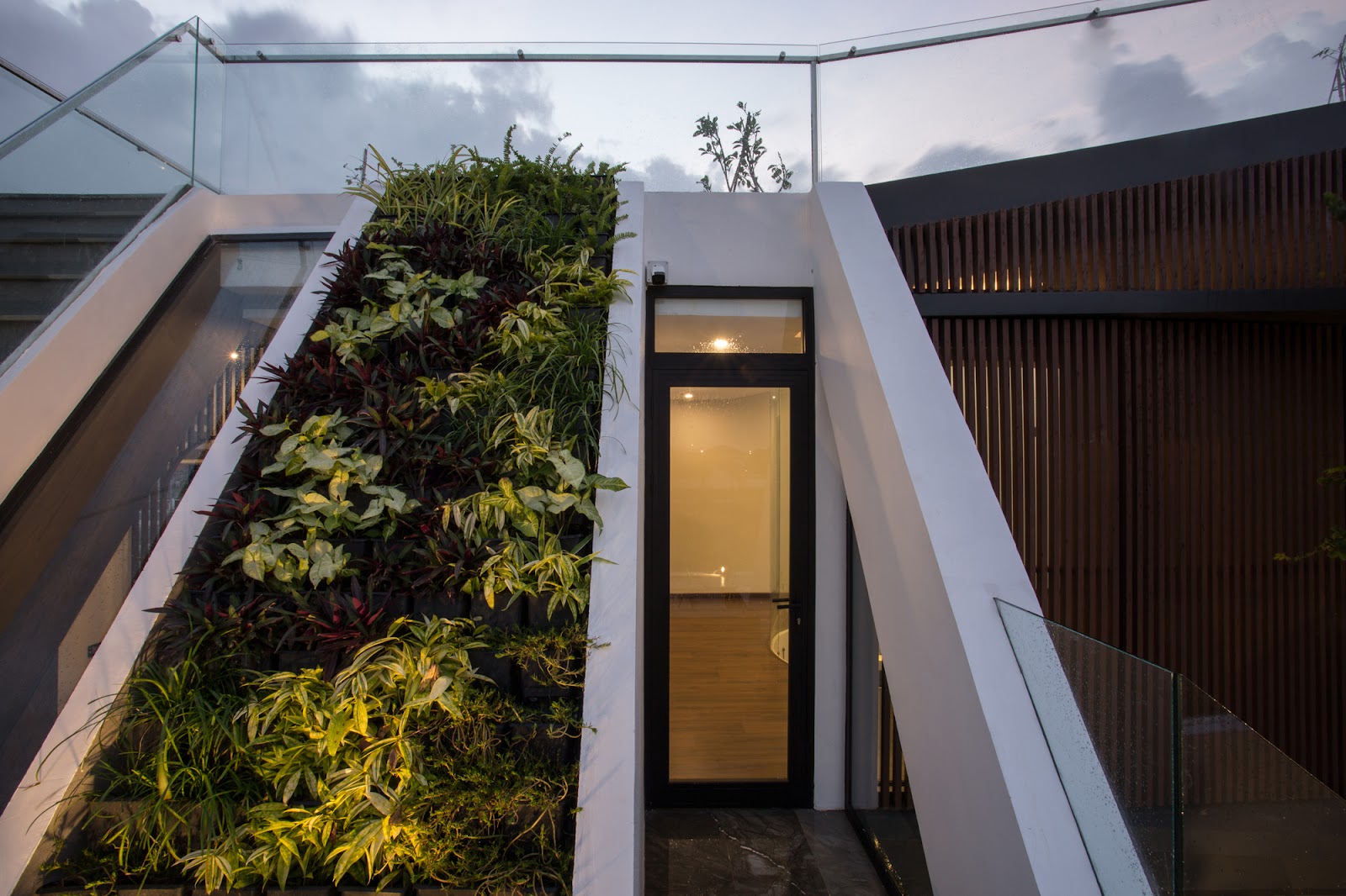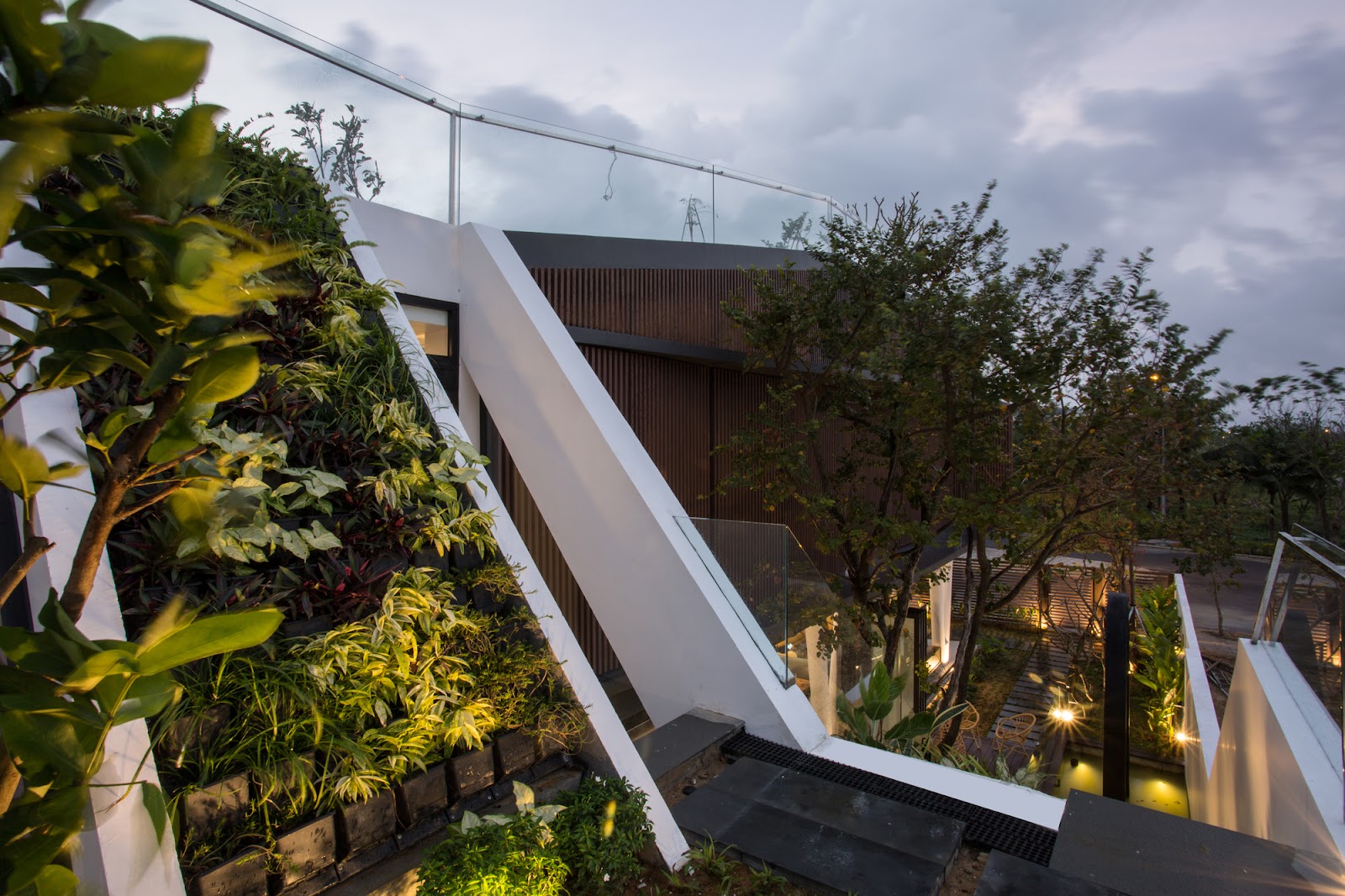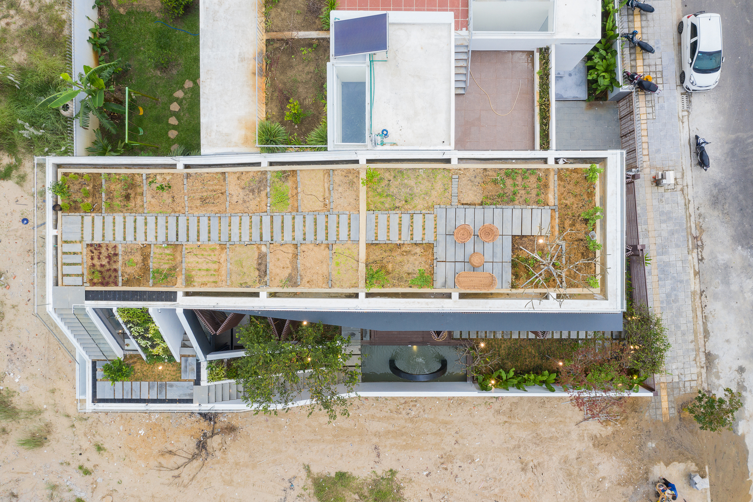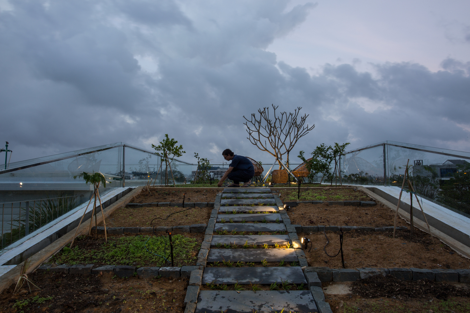 Trên sân thượng có một sân chơi nhỏ và một vườn thảo mộc cung cấp đủ rau cho nhu cầu sử dụng hàng ngày. Vườn thảo mộc sử dụng hóa chất không độc hại, an toàn cho người và vật nuôi; cũng sử dụng hệ thống tưới tuần hoàn tự động kiểm soát nhiệt độ và độ ẩm; bảo quản và phân phối lại nước từ mưa. Sau bốn năm thực hiện nhiều dự án, chúng tôi thừa nhận rằng, trên cùng một sàn bê tông, khu vực trồng cây có điều kiện tốt hơn những khu vực khác. Khu vực không trồng cây có các vết nứt trên bề mặt dẫn đến rò rỉ nước. Tôi khuyến khích mọi người trồng cây trên sân thượng của mình. Nó không chỉ tốt hơn cho môi trường mà còn bảo vệ công trình của bạn.