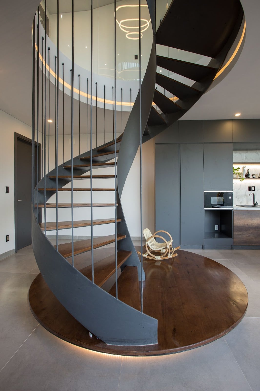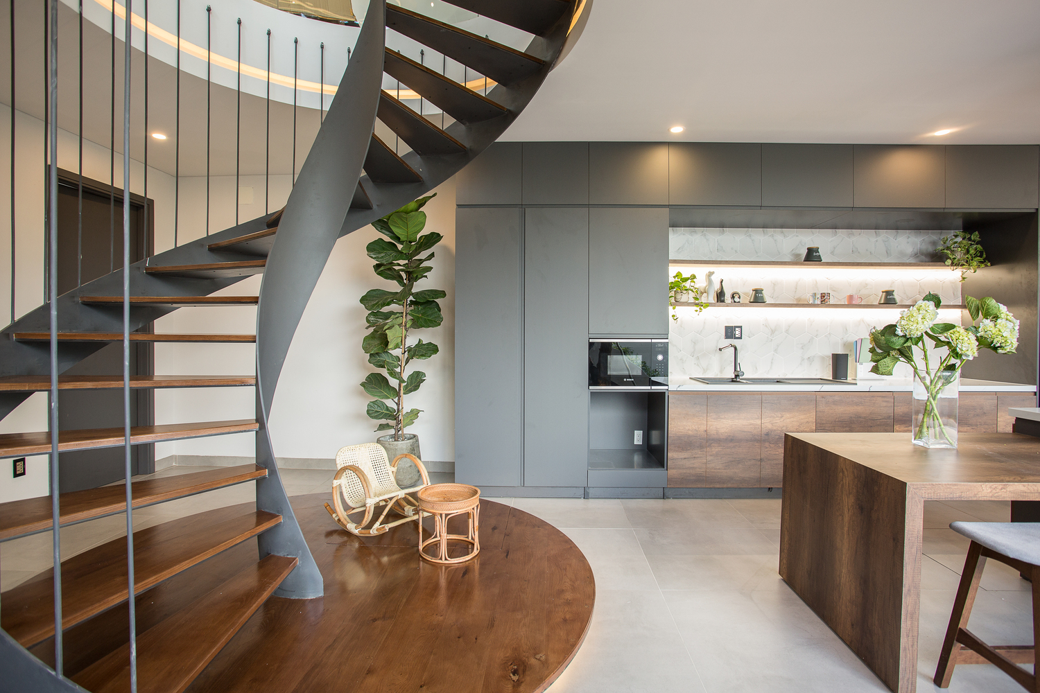 Tầng trệt có một phòng khách, một nhà bếp, một phòng ngủ cho khách, một phòng chứa đồ và một phòng giặt. Nhà bếp và phòng khách được kết nối theo thứ tự để tạo ra không gian lớn và linh hoạt, cũng như để giảm diện tích xây dựng và để lại nhiều không gian hơn cho khu vườn. Tất cả các phòng đều hướng ra khu vườn thông qua các cửa sổ trượt trong suốt lớn, giúp tạo ra sự thông gió tốt nhất cho ngôi nhà.