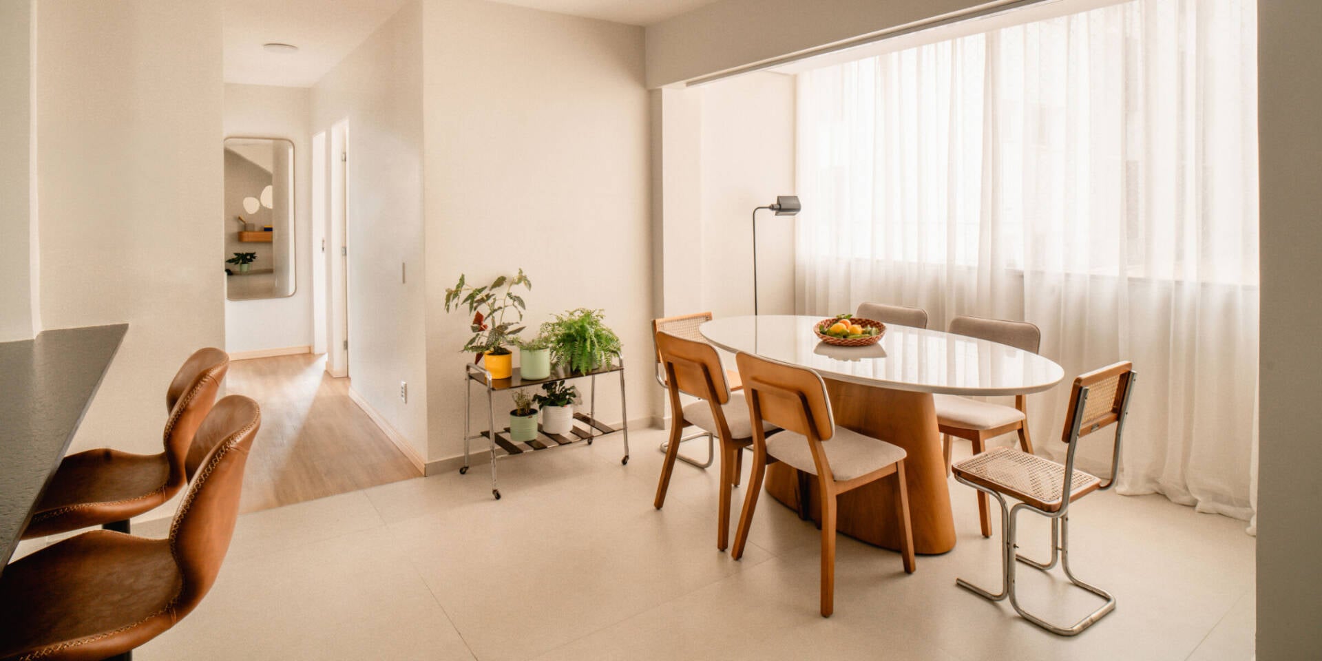 Chiếm phần lớn diện tích trong phòng khách là bộ ghế sofa màu nâu nhạt mang đến cảm giác nhẹ nhàng, thanh lịch nhưng không kém phần sang trọng. Phía sau sofa là chiếc tủ kính sát trần, có thể được tận dụng làm tủ rượu hoặc là nơi chứa các vật dụng trang trí xa hoa mà gia chủ đặt lên.