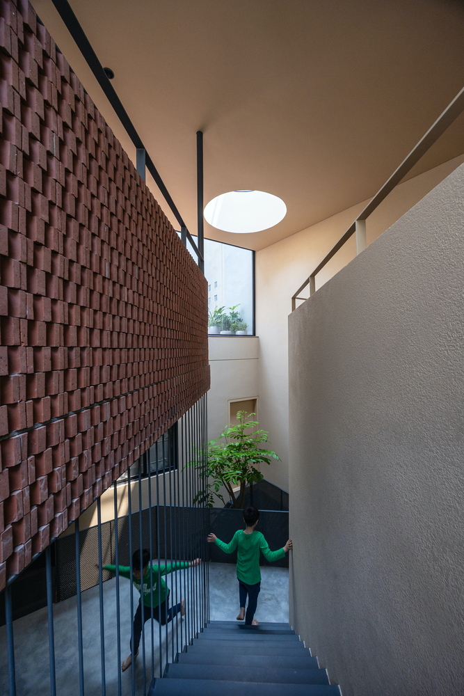 Tường gạch trần với những khoảng đục tinh tế, vừa mang tính thẩm mỹ, vừa điều tiết gió và ánh sáng cho nhà trong ngõ