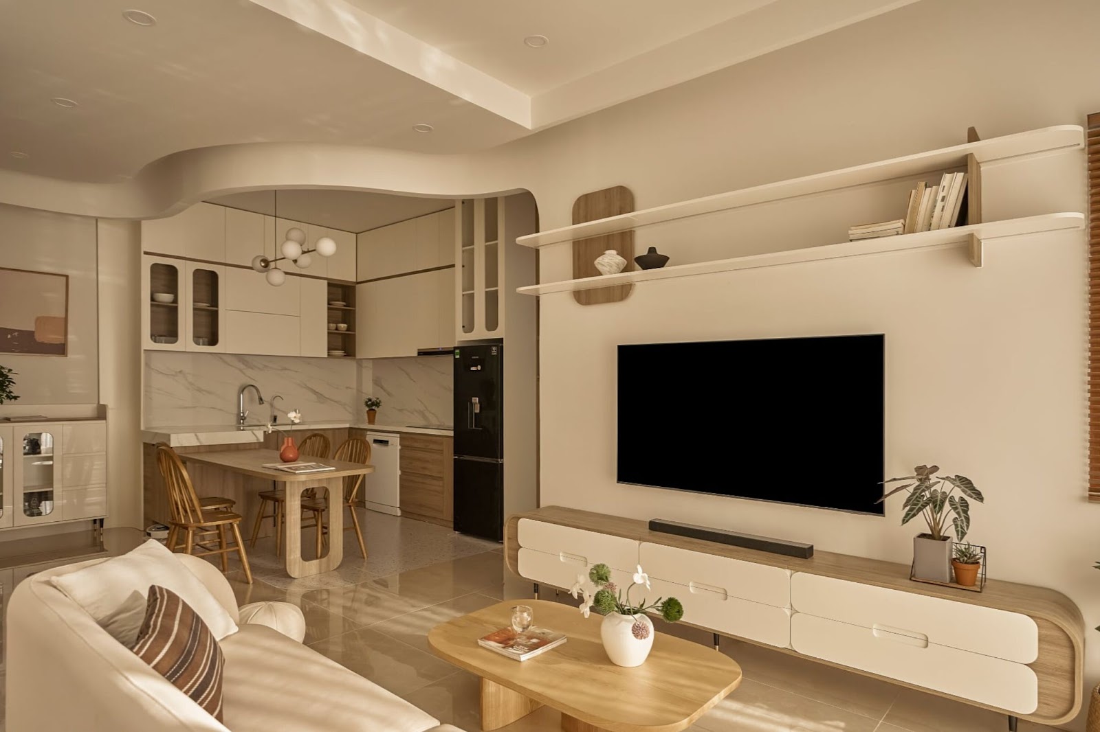 Tông màu be – nâu kết hợp nội thất gỗ làm nổi bật cảm giác ấm cúng, mộc mạc nhưng không kém phần tinh tế