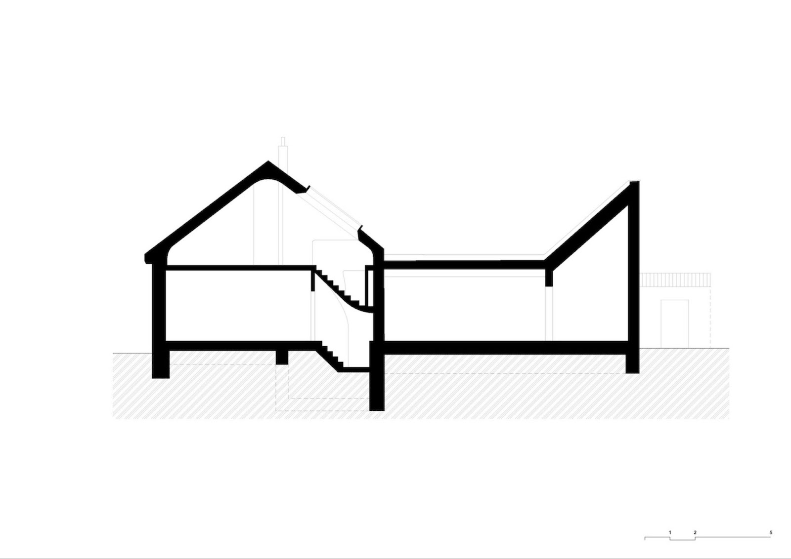 Một phòng áp mái được bổ sung, đây là khu vực vẽ tranh của người chồng với cửa sổ mái lớn hướng bắc, cung cấp ánh sáng tự nhiên ổn định và dịu nhẹ, phù hợp cho hoạt động sáng tác. Một khối nhà nhỏ được xây dựng mới, có phòng ngủ và phòng tắm riêng biệt. Hai khối nhà được kết nối bằng không gian bếp - phòng ăn mở, liền mạch với sân hiên, tạo nên sự giao thoa giữa nội thất và thiên nhiên.