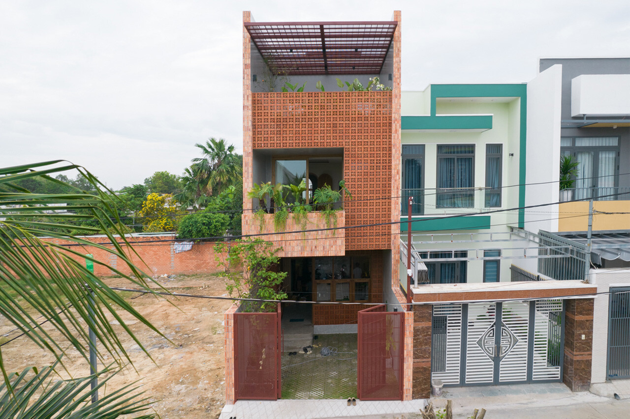 Không chỉ mang lại hiệu quả thẩm mỹ, những viên gạch đất nung còn giữ vai trò quan trọng trong việc điều tiết vi khí hậu – giúp chống nắng, thông gió và tạo nên lớp màng chuyển tiếp giữa bên trong và bên ngoài công trình. Việc lồng ghép yếu tố cây xanh ở nhiều vị trí như ban công, sân thượng, gầm cầu thang… càng làm nổi bật tinh thần gắn kết với thiên nhiên một cách mộc mạc nhưng có tính toán rõ ràng.