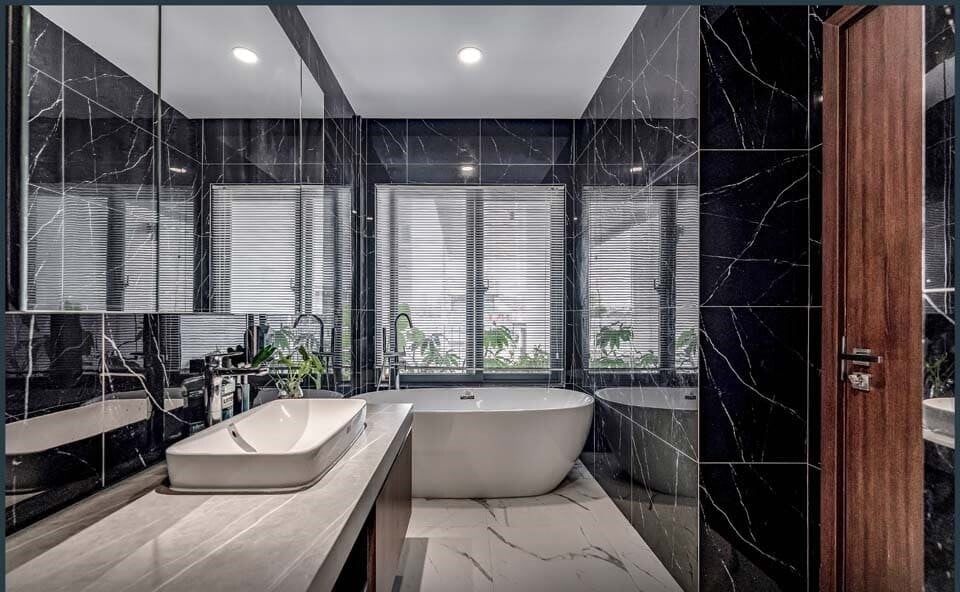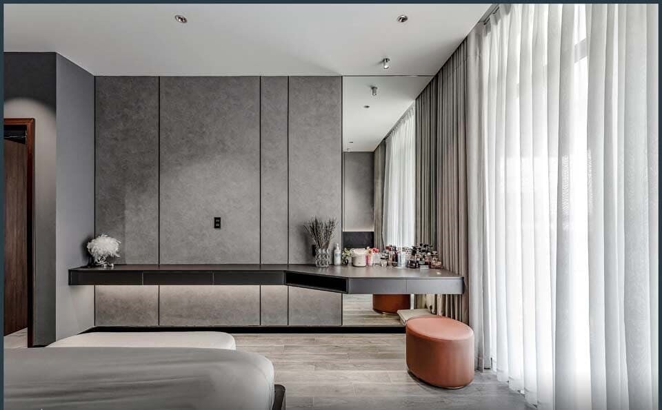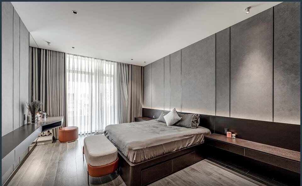 Phòng ngủ Master được thiết kế mang đậm dấu ấn cá nhân với sự sang trọng và lịch lãm. Việc sử dụng sự tương phản của tone màu tối (đen, xám) không chỉ tạo nên một không gian nghỉ ngơi yên tĩnh mà còn khẳng định gu thẩm mỹ tinh tế của gia chủ. Không gian được tối ưu hóa sự tiện nghi với phòng thay đồ riêng biệt và tinh tế, giúp căn phòng luôn gọn gàng và đẳng cấp.