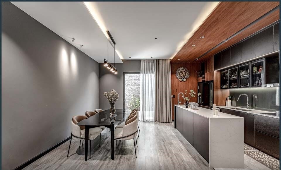 Phòng bếp hiện đại được trang bị đầy đủ thiết bị cao cấp, tối ưu hóa công năng, giúp việc nấu nướng trở nên dễ dàng và tiện lợi. Phía sau nhà, tiểu cảnh nhỏ không chỉ giúp lấy sáng mà còn cân bằng màu sắc, tạo không gian xanh mát, đầy sức sống cho ngôi nhà.