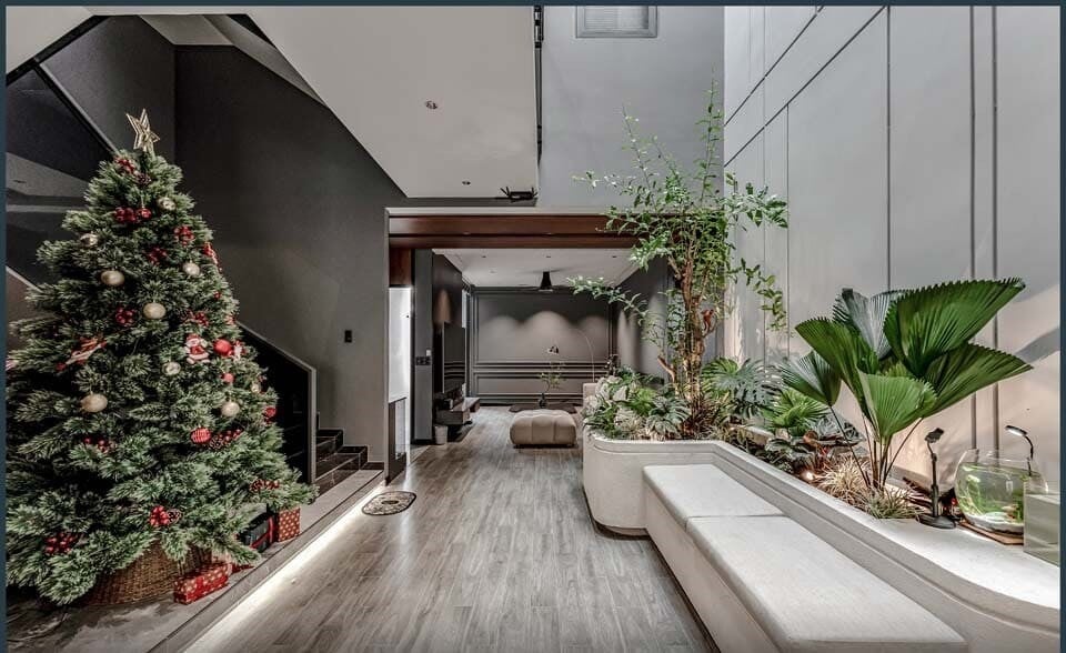 Khu vực phòng khách và bếp ăn được bố trí liền kề theo không gian mở - một giải pháp tối ưu diện tích. Điểm nhấn độc đáo tại đây là không gian thông tầng có tiểu cảnh và bệ ngồi, tạo ra một góc thư giãn lý tưởng, kết nối các thành viên trong gia đình.