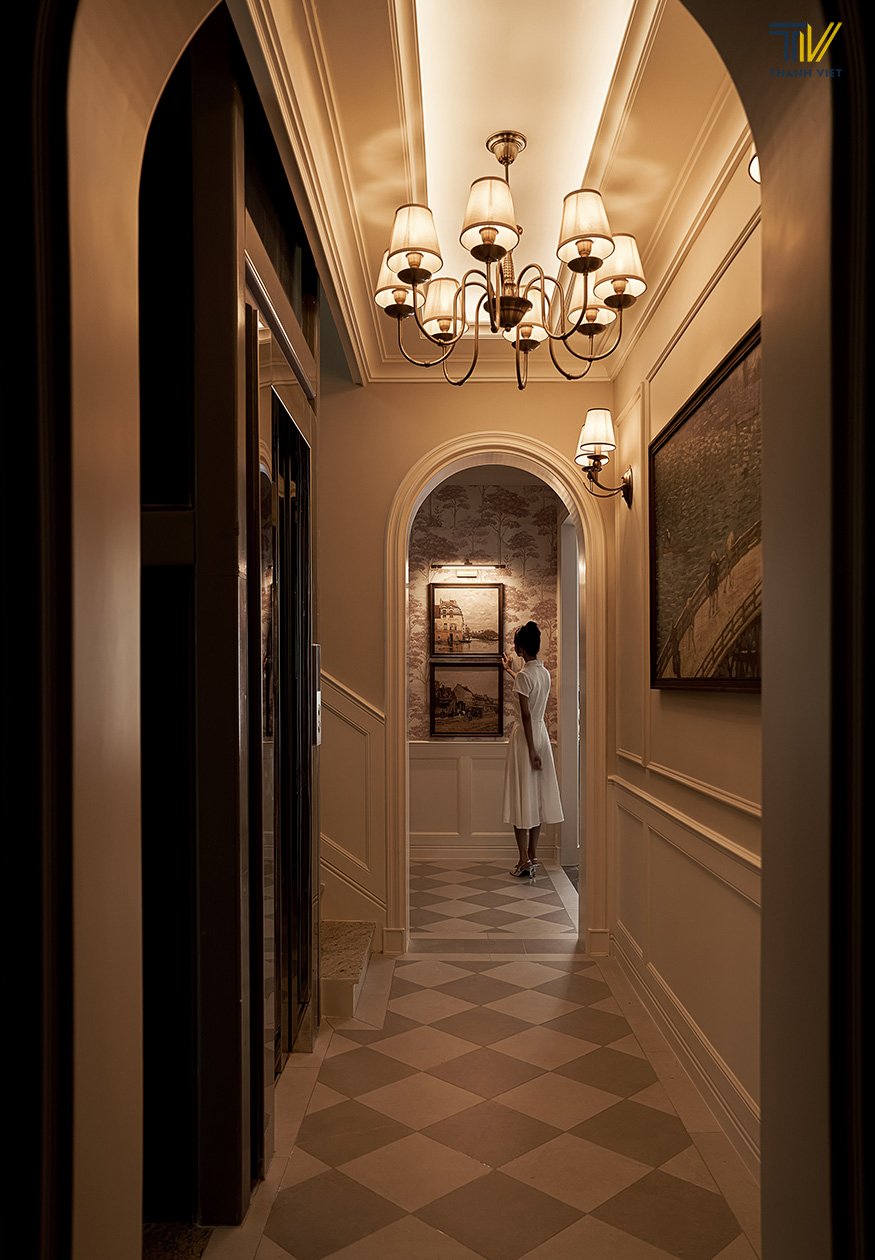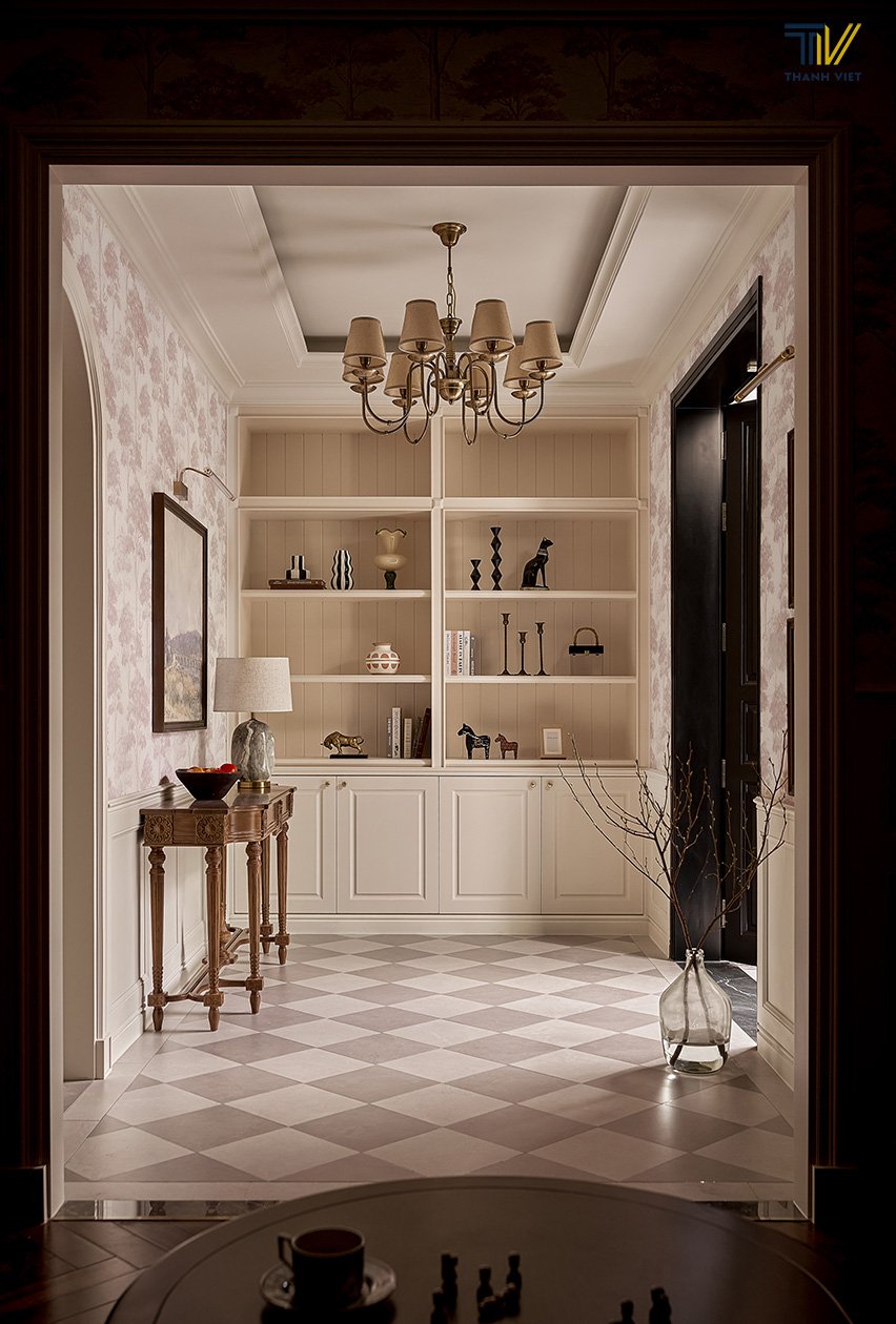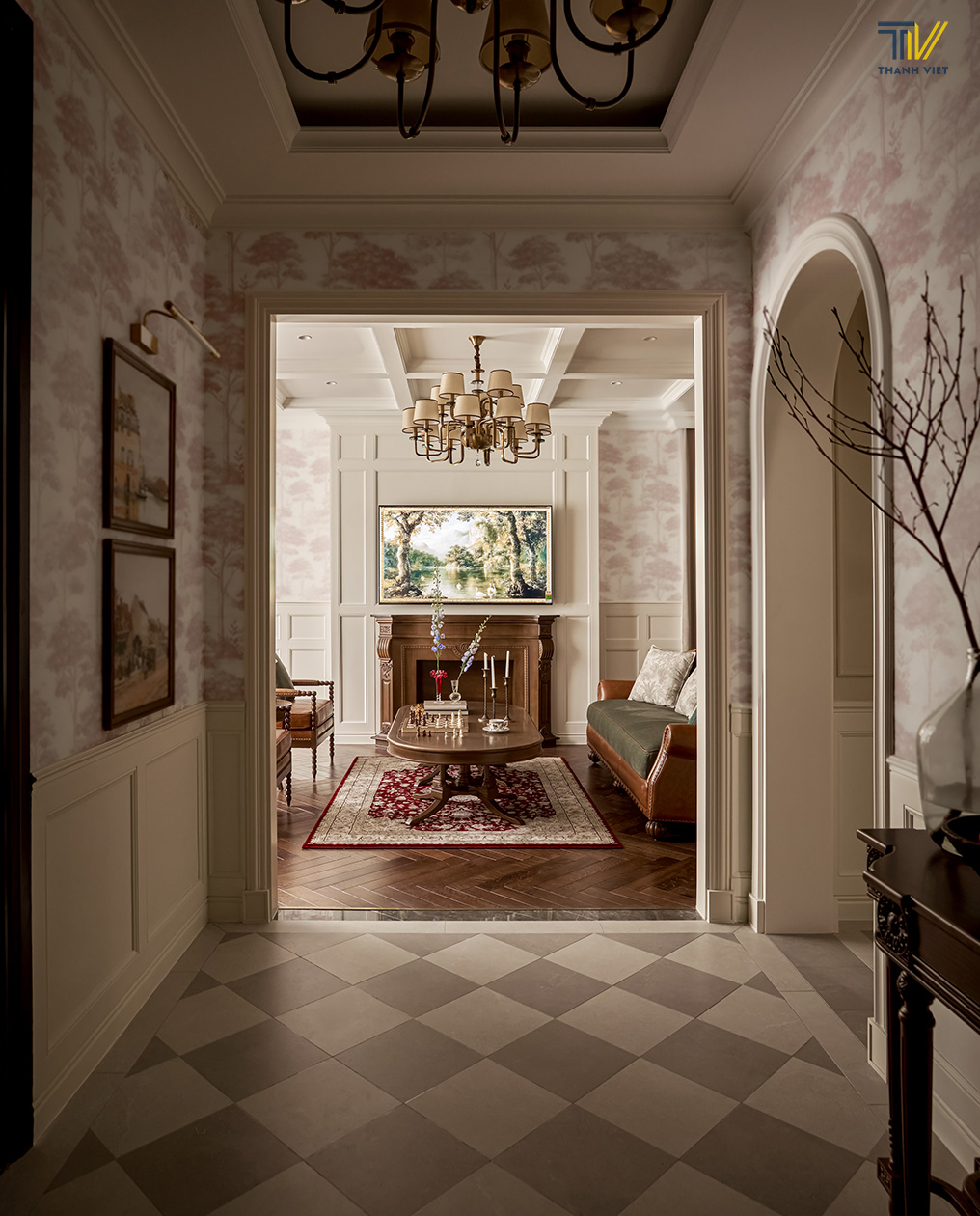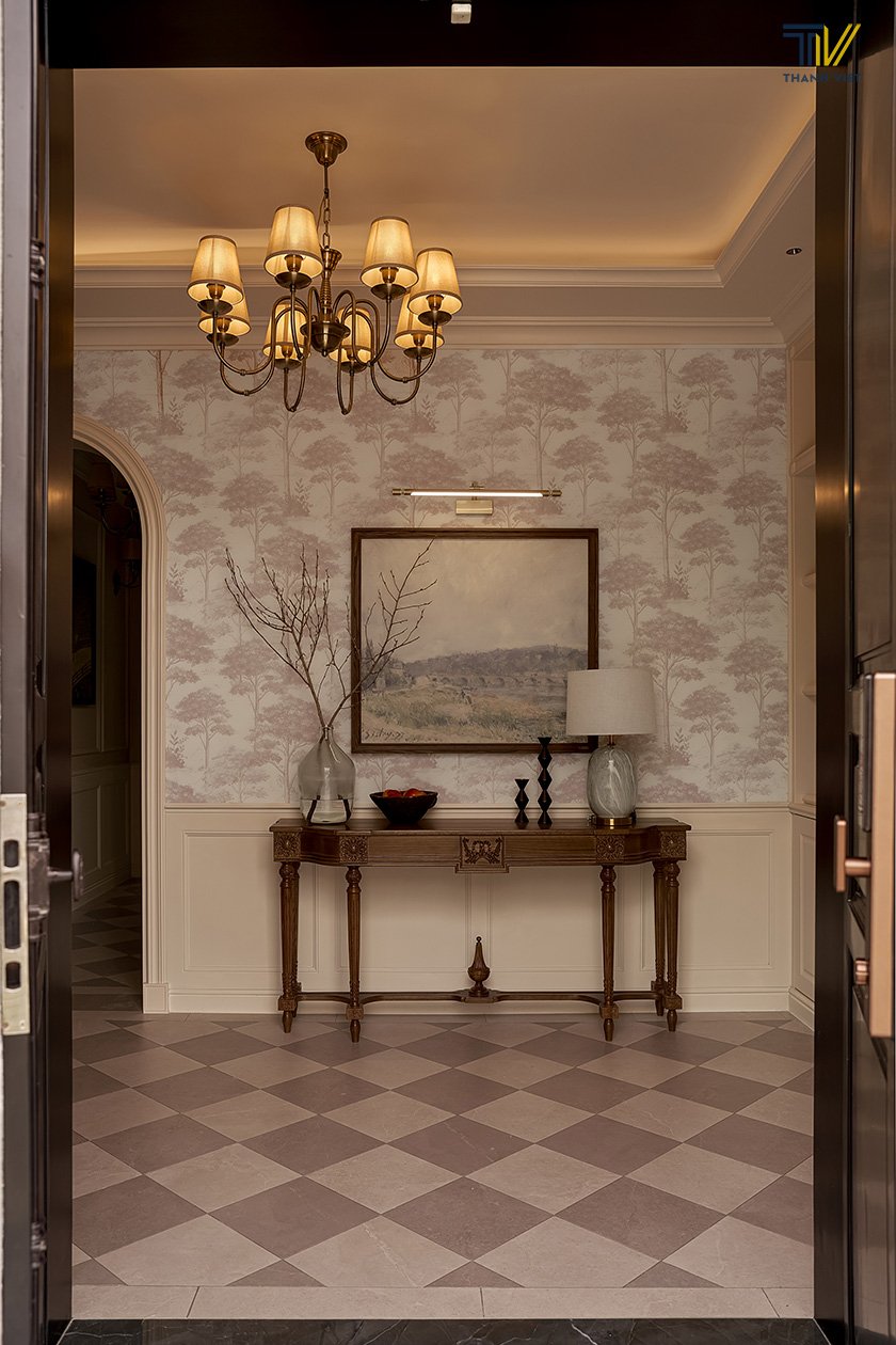 Ngoài ra, đèn chùm cổ điển, gạch lát sàn họa tiết caro cũng giúp không gian được phân chia rõ nét. Chúng vừa như một lời dẫn mở về phong cách tổng thể của biệt thự, vừa tạo nên một lời chào đầu đầy tinh tế.