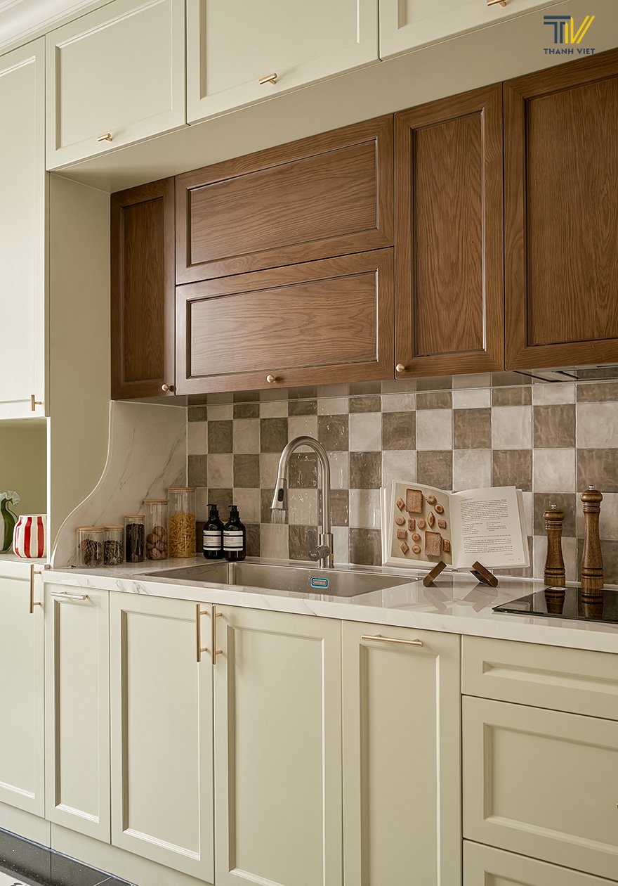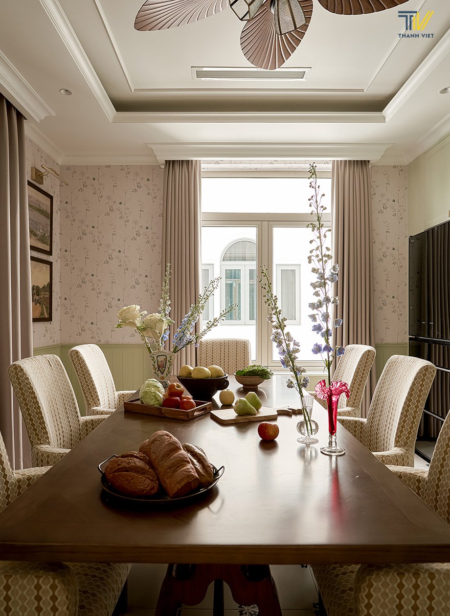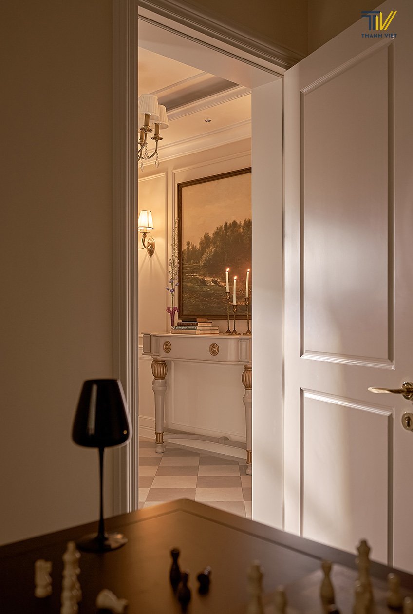 Ngoài ra, đèn chùm cổ điển, gạch lát sàn họa tiết caro cũng giúp không gian được phân chia rõ nét. Chúng vừa như một lời dẫn mở về phong cách tổng thể của biệt thự, vừa tạo nên một lời chào đầu đầy tinh tế.