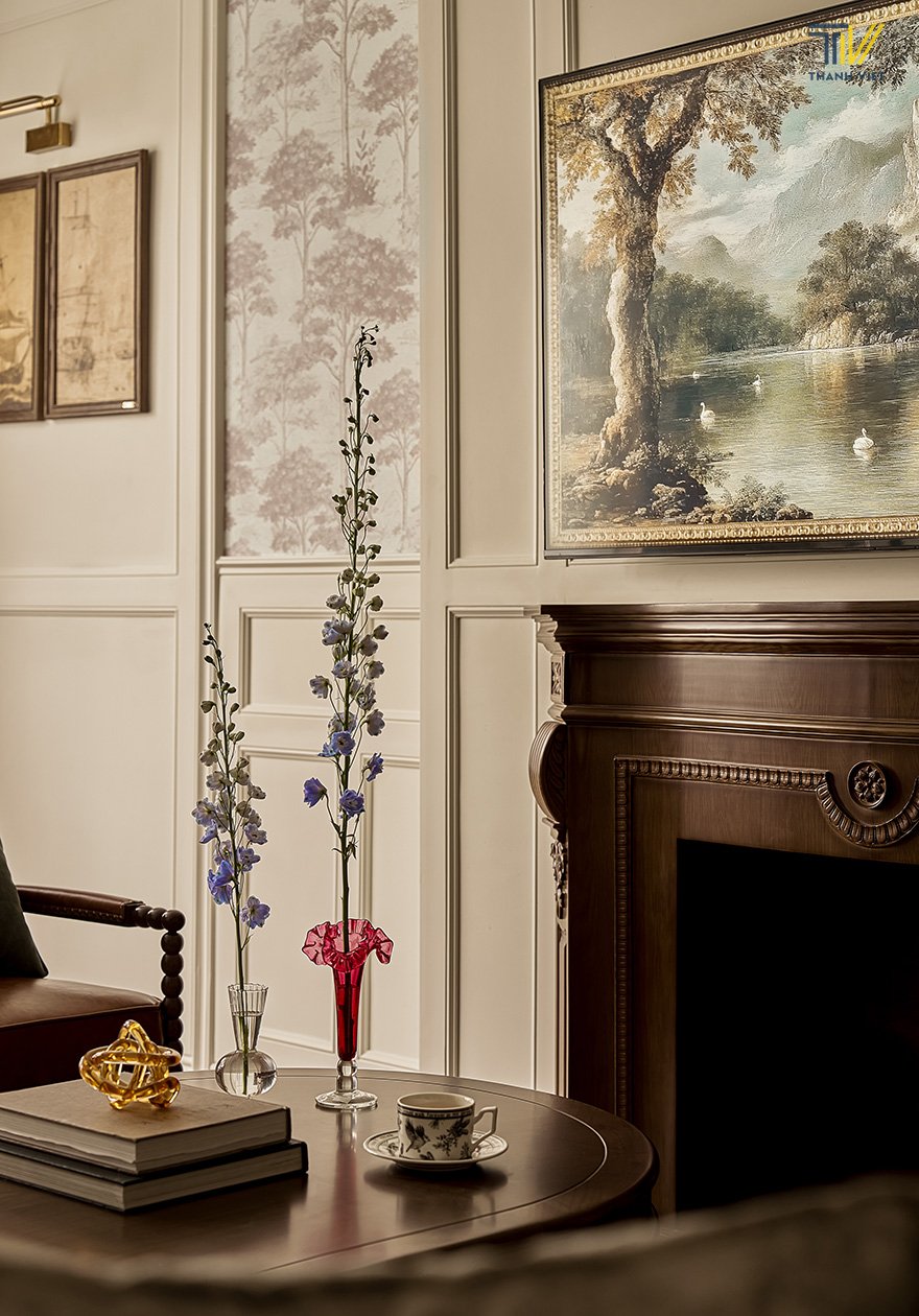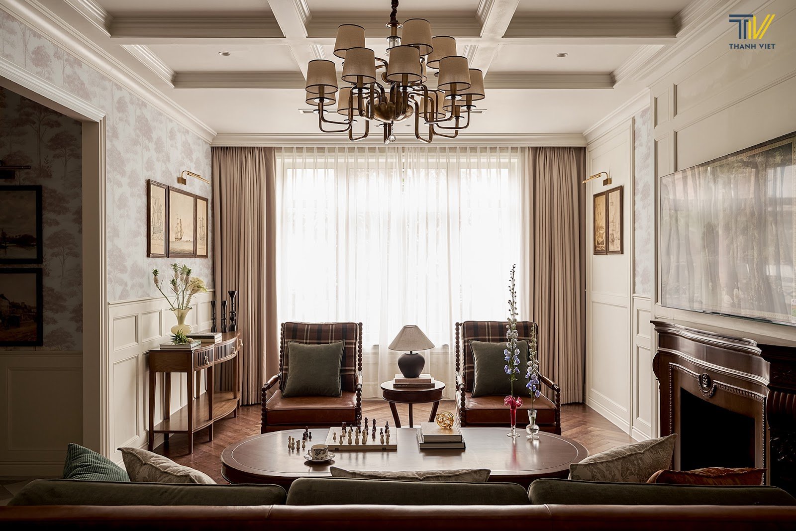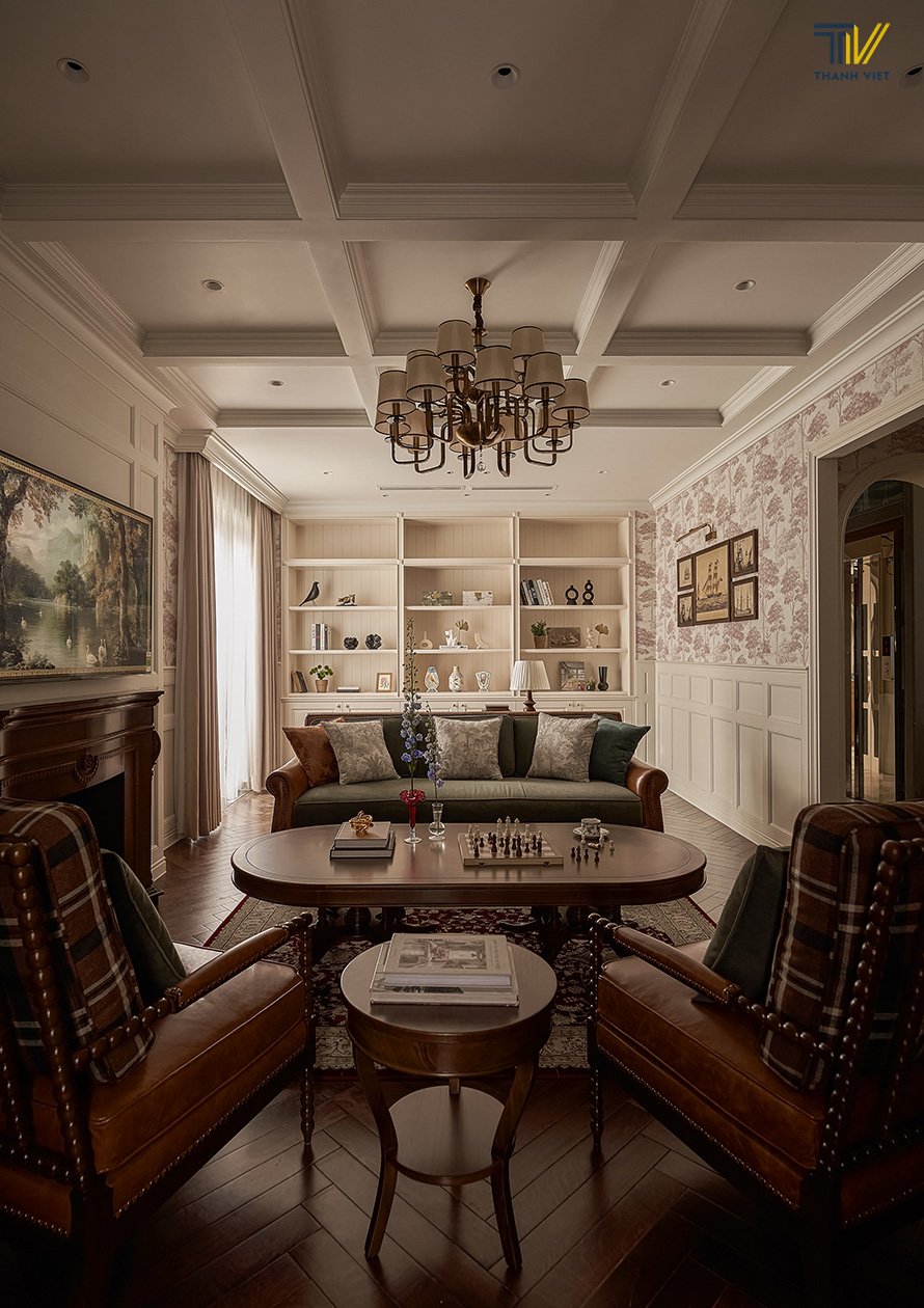 Thứ hai chính là sự lựa chọn tinh tế của gia chủ cho màu sắc không gian. Tone màu trầm nhiều sắc độ được lựa chọn: từ màu gỗ của bàn trà, màu chất liệu da bọc ghế đến lò sưởi, phào tường,… mang điểm nhấn tinh thần Classic giúp không gian toát lên được vẻ trang nhã và lịch thiệp.