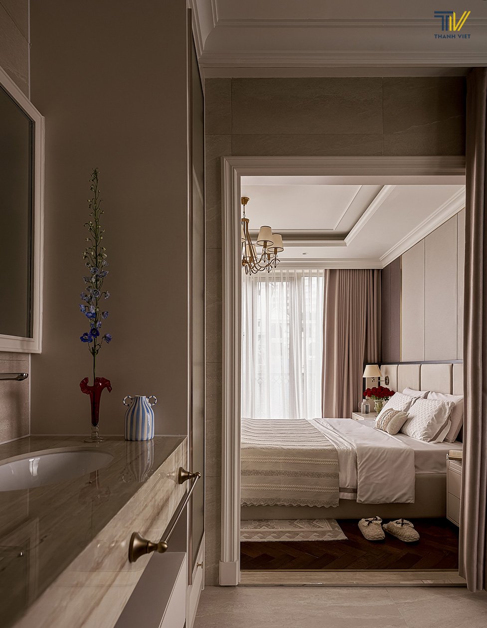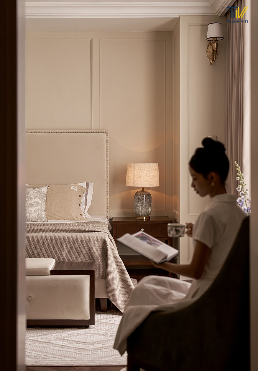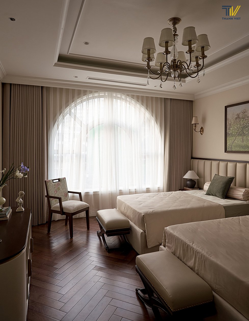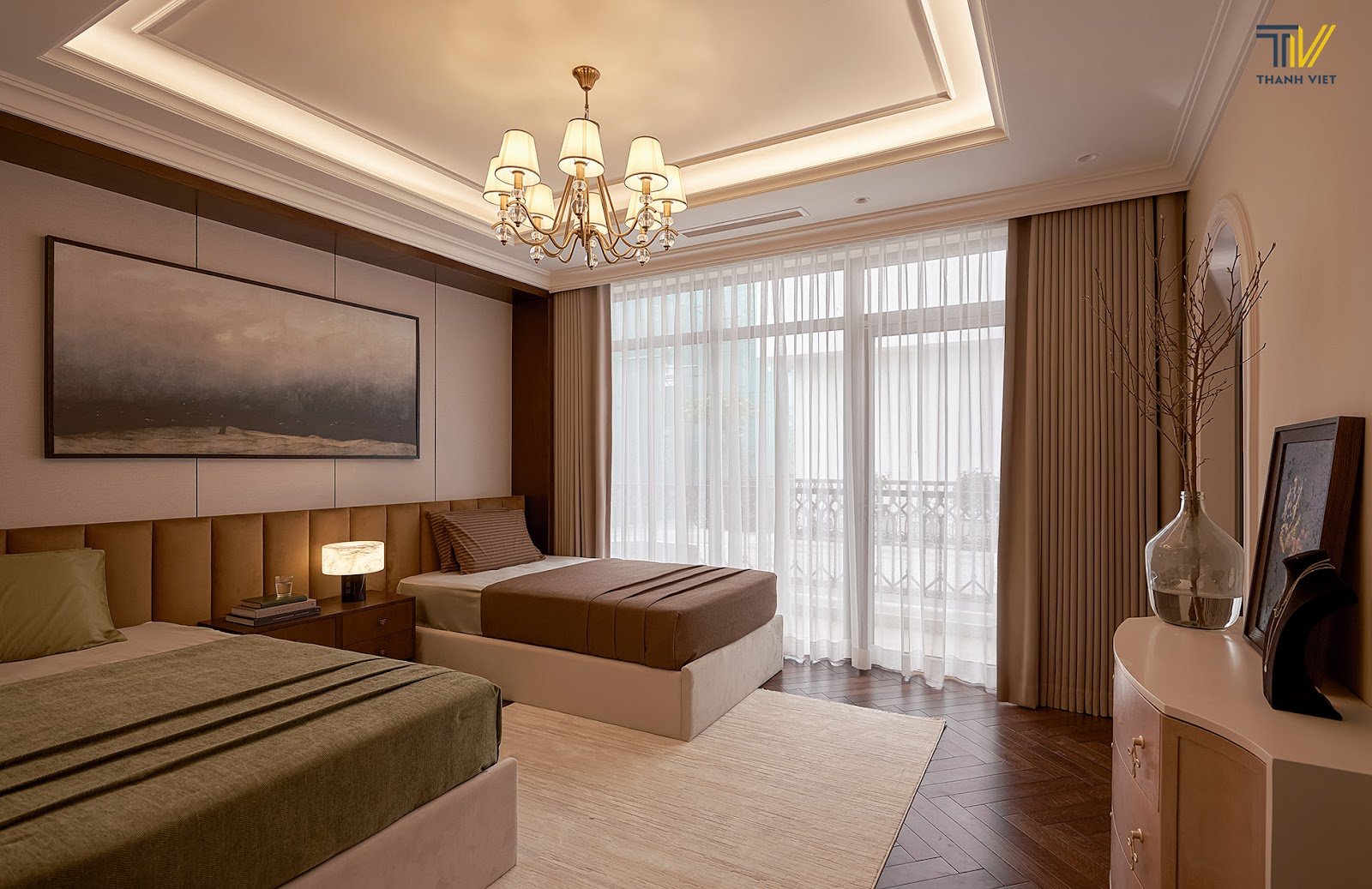 Phòng ngủ Twin tầng 3 càng khẳng định sự khác biệt của mô hình biệt thự công sở mà Thanh Viet Interior đã mang lại - nơi mà mỗi chi tiết đều được "đo ni" cho những chuyến công tác.