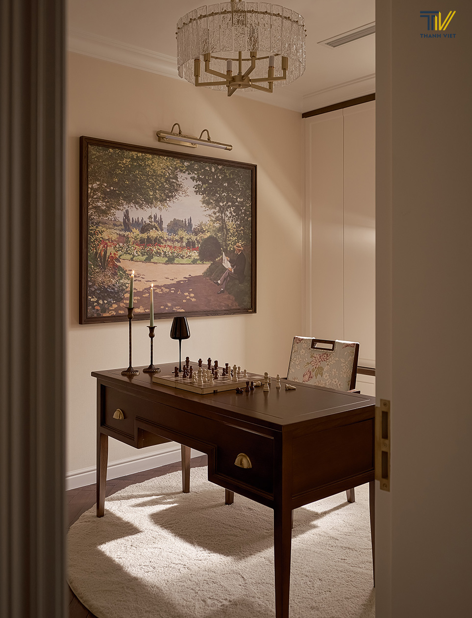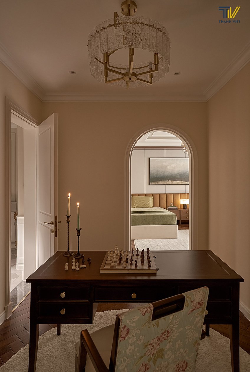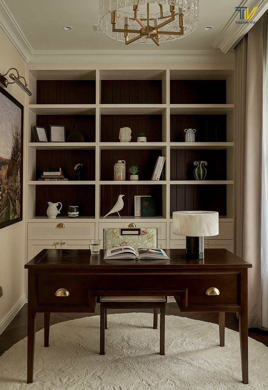 Không gian làm việc rộng thoáng nhờ chia lại công năng hợp lý. Ánh sáng tự nhiên qua bề mặt kính, hỗ trợ tập trung mà vẫn giữ sắc thái sang trọng đồng bộ với tổng thể biệt thự.