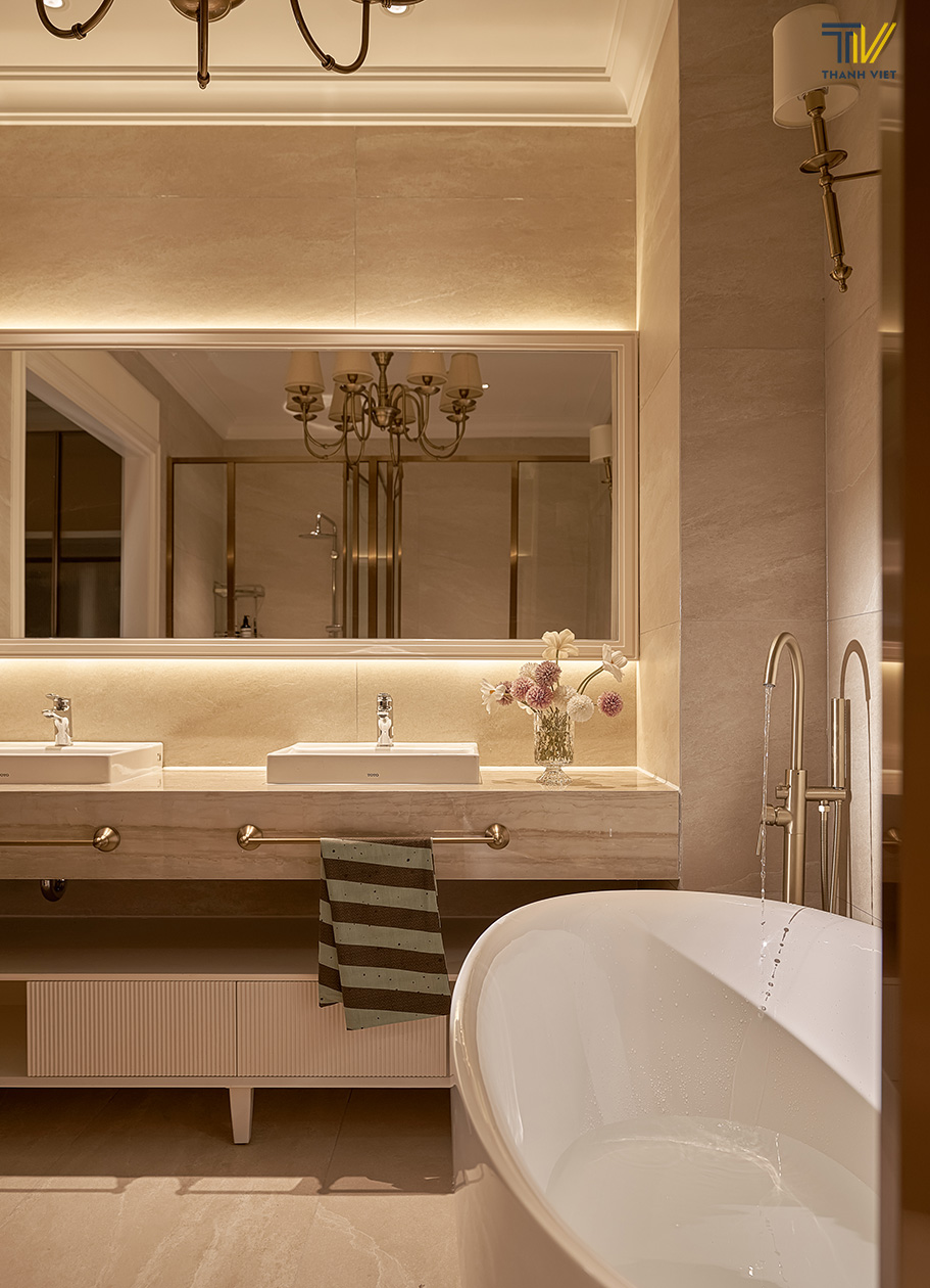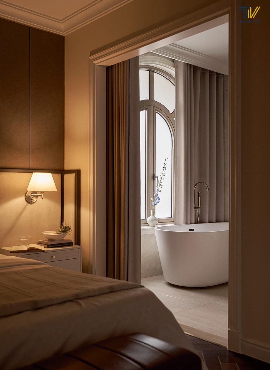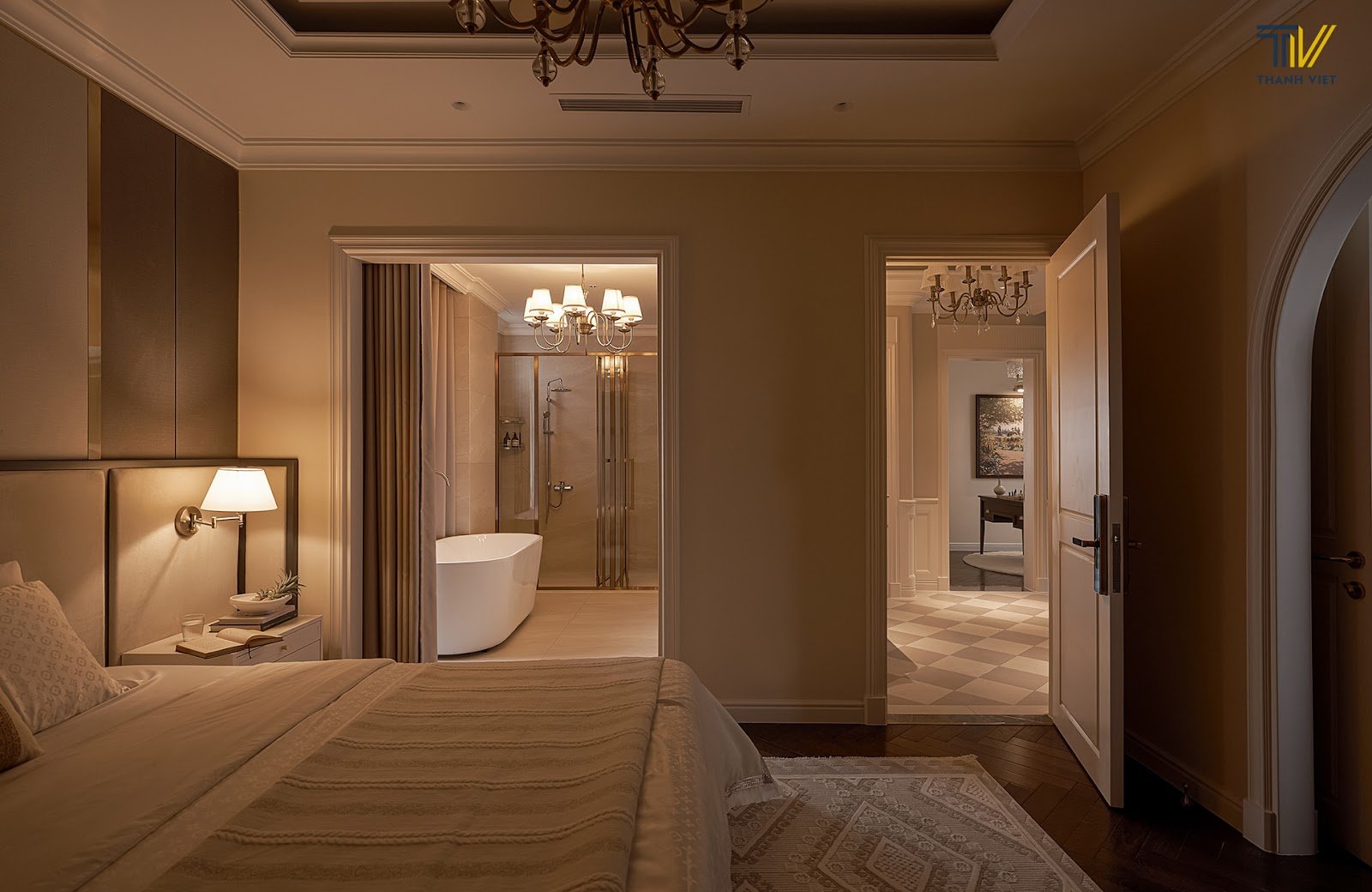 Phòng ngủ King có phòng tắm lớn với khu tắm đứng và bệt được ngăn cách bởi vách kính; bồn tắm bằng đá lớn và lavabo đôi vô cùng cao cấp, đảm bảo trải nghiệm lưu trú chất lượng cho gia chủ.