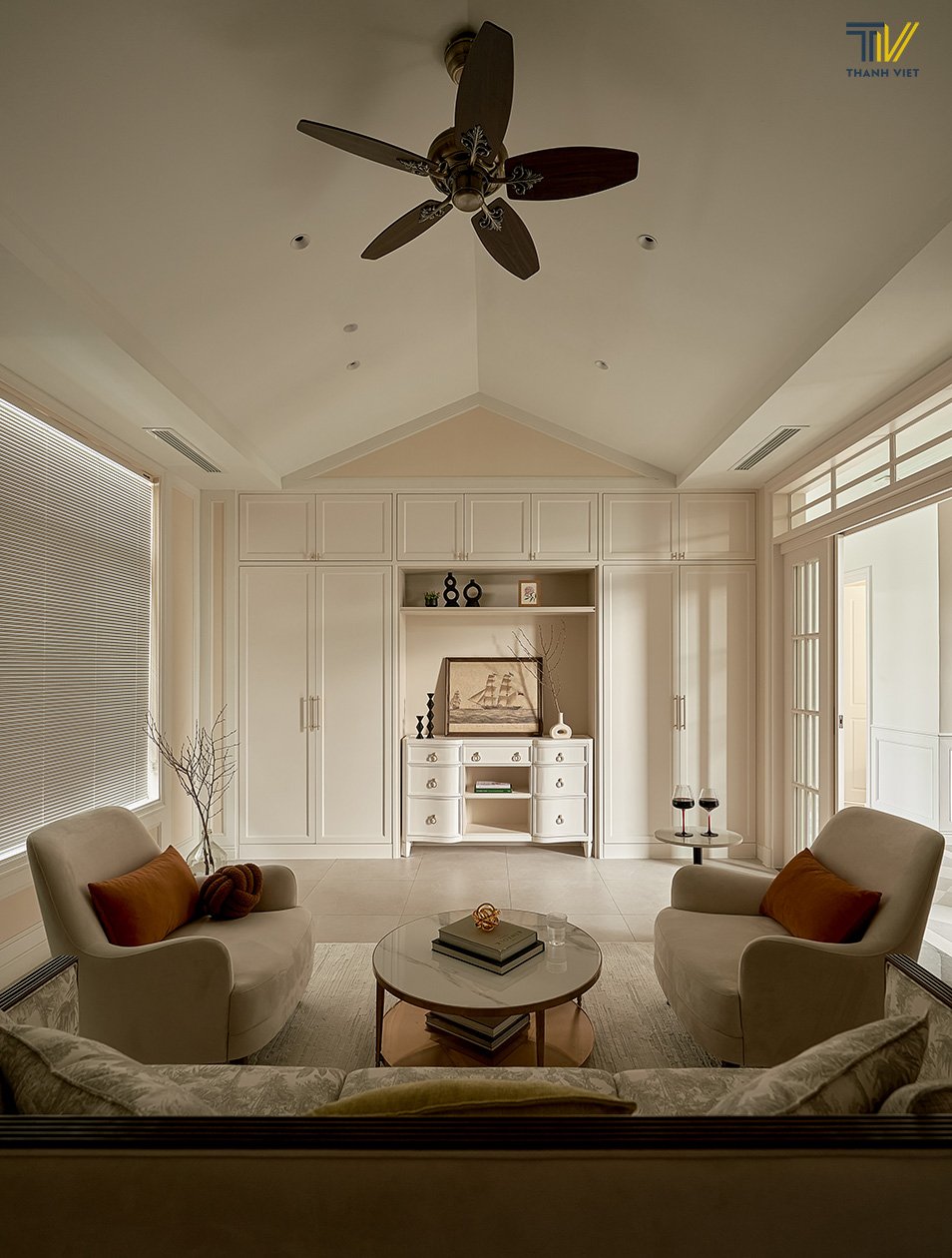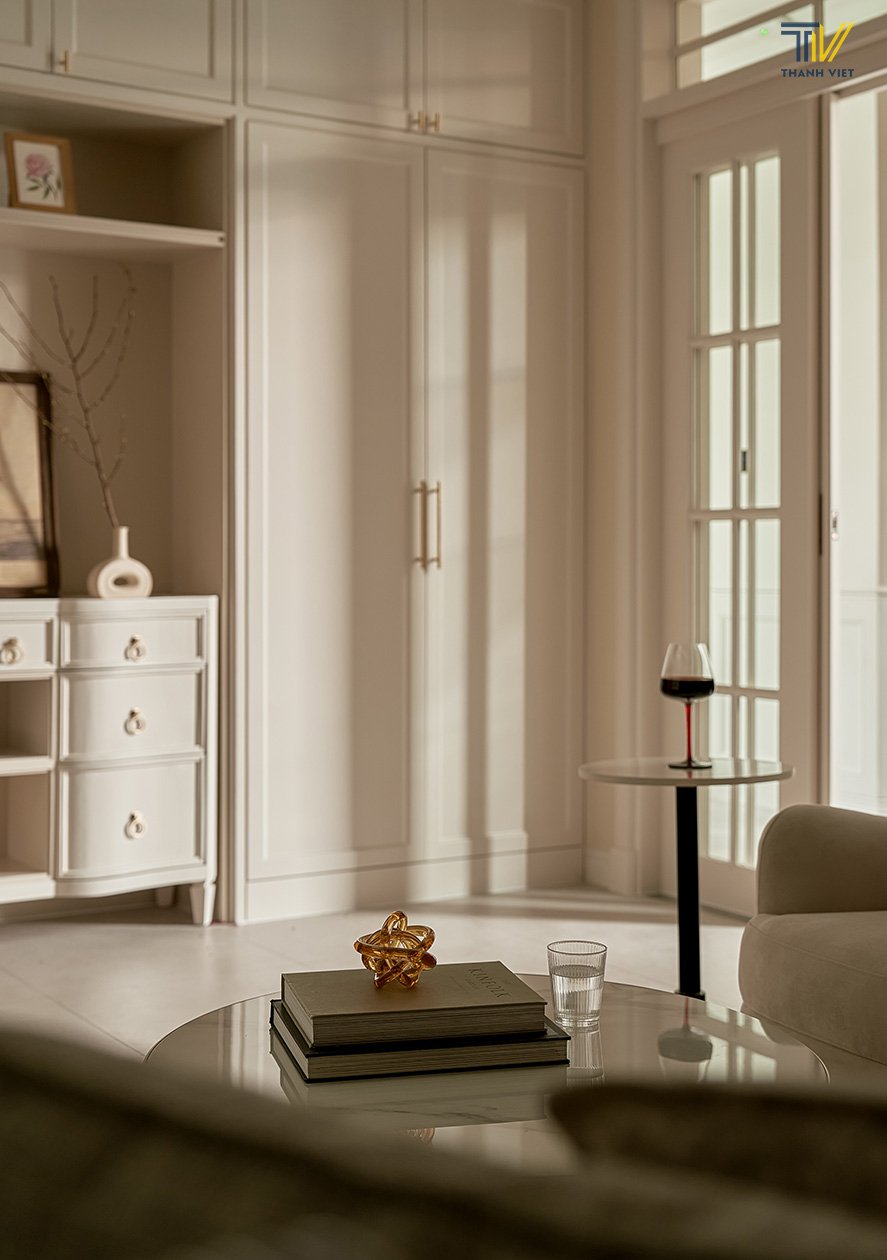 Kiến trúc sư của Thanh Viet Interior cũng đã tính toán kỹ lưỡng để loại bỏ đi các không gian lưu trữ ít dùng trong nhà ở truyền thống, nới rộng không gian, dành chỗ cho những tiện nghi khác như phòng làm việc chất lượng cao, phòng tắm tiêu chuẩn 5 sao.