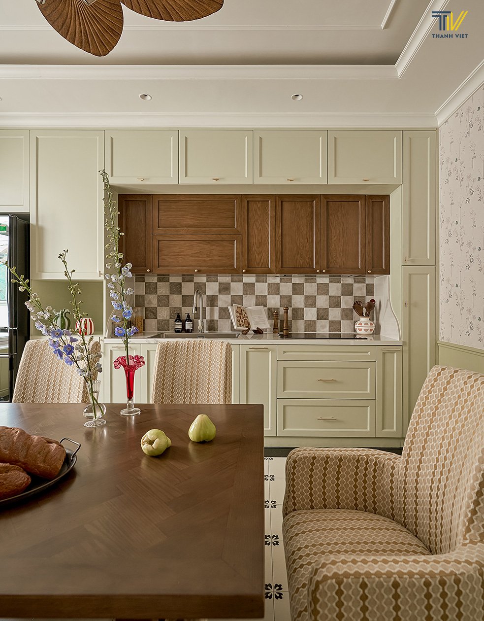 Khu vực bếp - ăn được thiết kế đầy đủ công năng, thuận tiện cho sử dụng, nấu nướng. Hệ tủ bếp lớn được tích hợp đầy đủ thiết bị nhà bếp hiện đại; bàn ghế ăn cao cấp với ghế ăn thoải mái,... khẳng định sự đầu tư chỉn chu của gia chủ.
