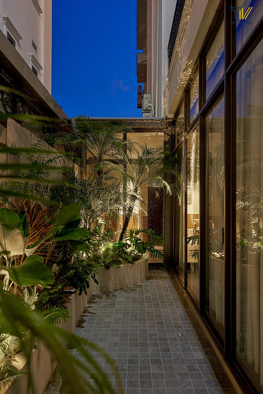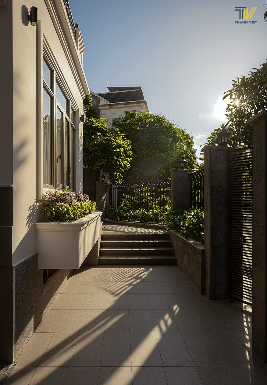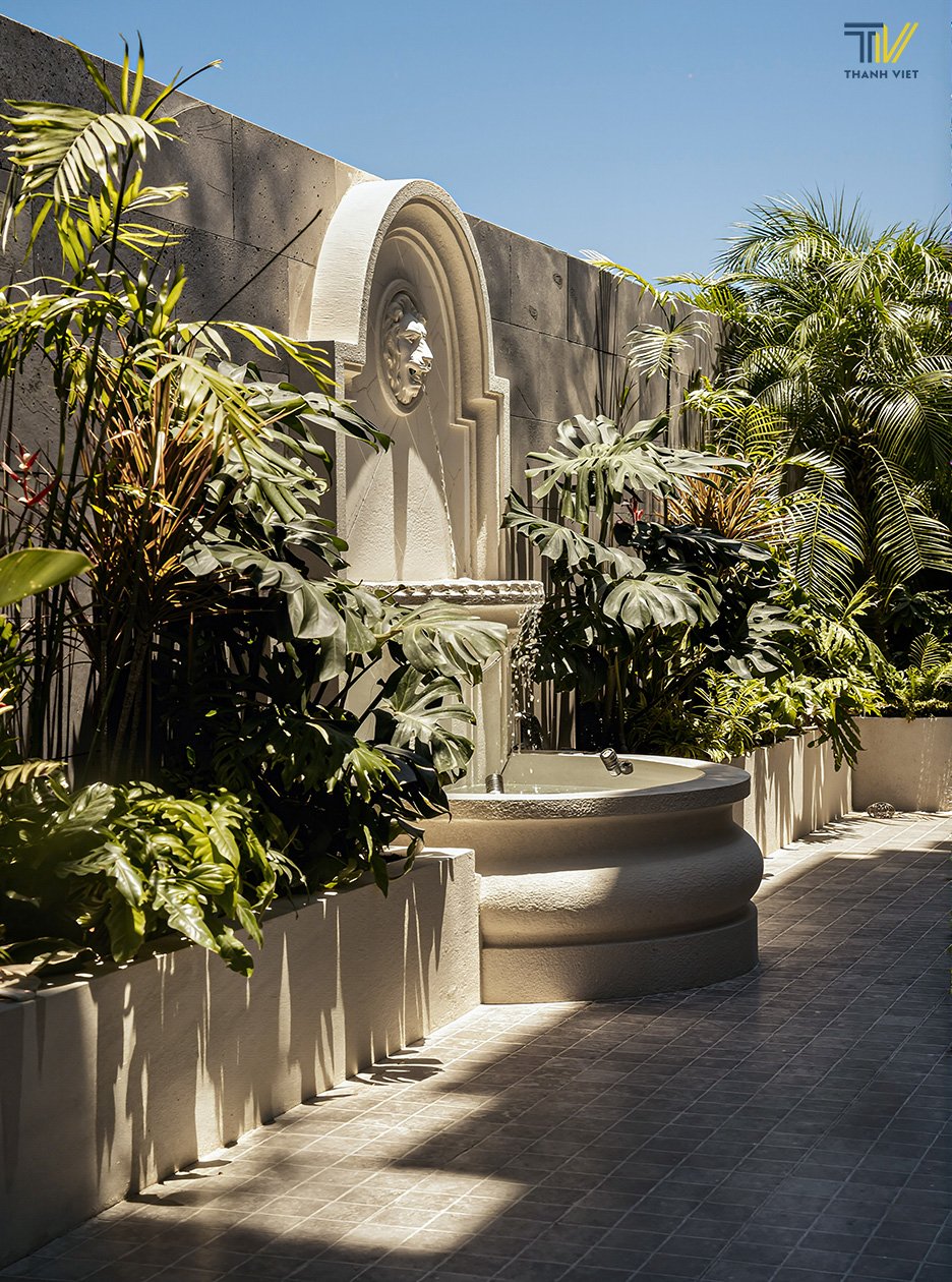 Ngoài kiến trúc đặc sắc, căn biệt thự còn lung linh giữa những bụi cây, tán lá. Khu vực tiểu cảnh đã được đội ngũ kiến trúc sư của Thanh Viet Interior bổ sung, nhằm mang đến không gian sống xanh, trong lành cho gia chủ.