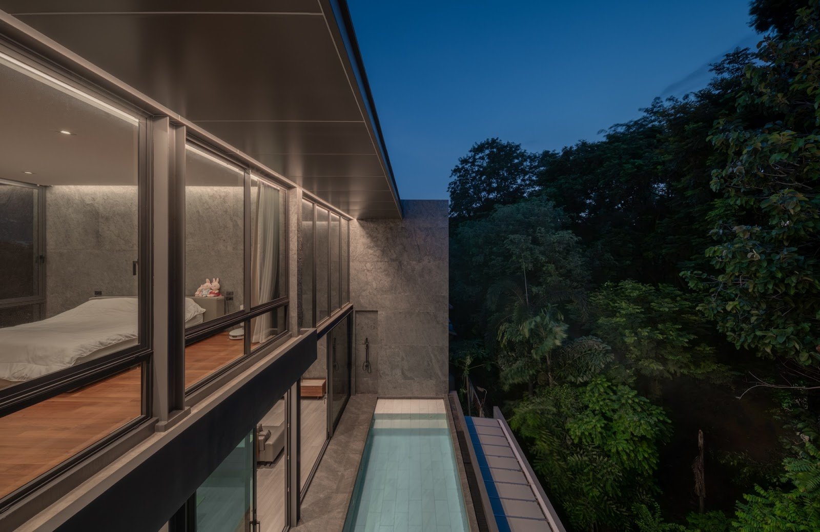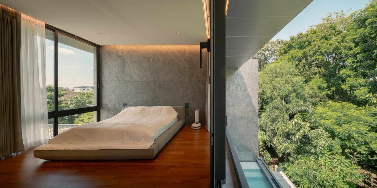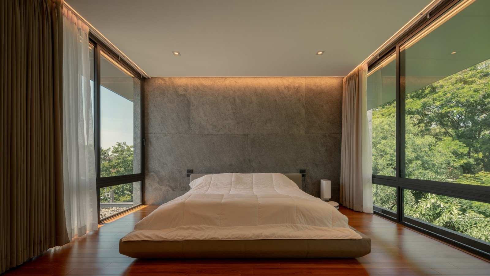 Phòng ngủ trên tầng hai mở rộng tầm nhìn ra thiên nhiên, đồng thời kết nối trực tiếp với hồ bơi ngoài trời, tạo cảm giác liền mạch giữa riêng tư và thư giãn