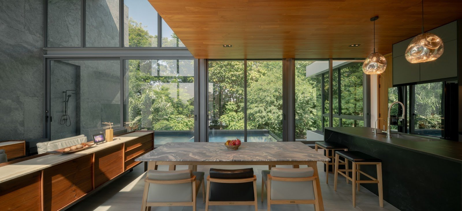Trần gỗ ấm áp bao phủ khu bếp và phòng ăn ăn đối lập với khối đá lạnh, mang lại sự cân bằng về vật chất và cảm xúc. Những ô cửa kính lớn mở rộng ra hồ bơi và ban công, tăng khả năng lấy sáng tự nhiên và gió trời, tạo nên không gian sinh hoạt vừa thoáng đãng, vừa gắn bó mật thiết với cảnh quan xung quanh.