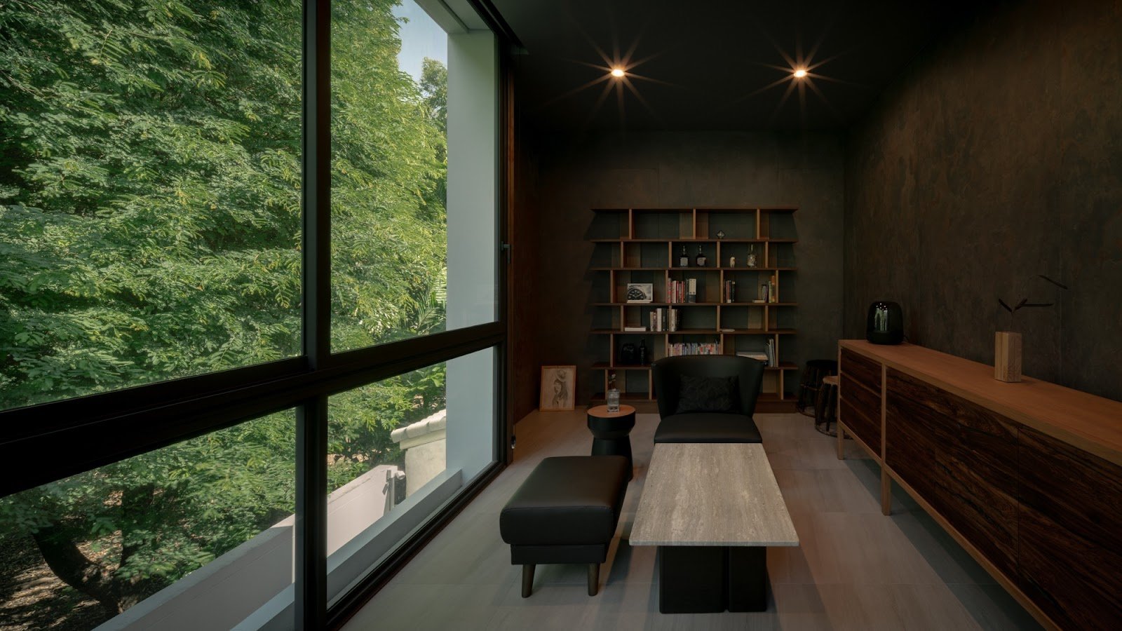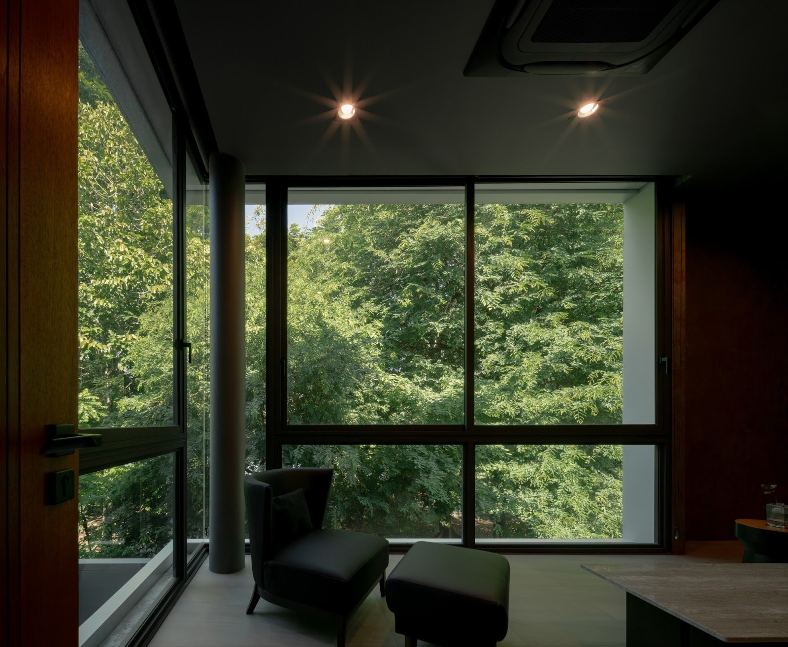 Phòng đọc nhỏ gọn với gam màu trầm, nơi ánh sáng tự nhiên tràn qua cửa kính toàn phần, mở tầm nhìn ra mảng xanh tĩnh lặng