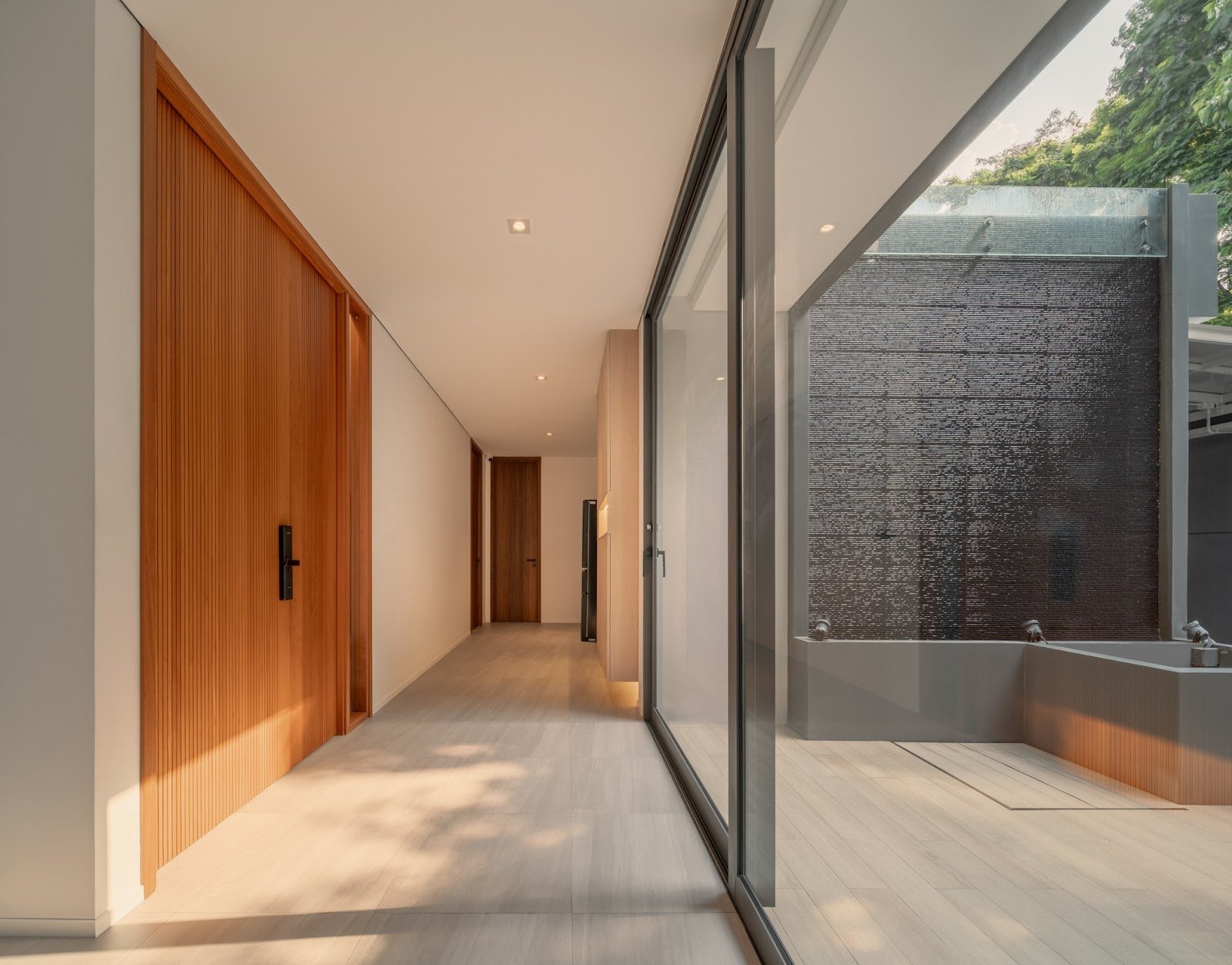 Hành lang dài với một bên là cửa kính mở ra sân trong, đưa ánh sáng và bóng cây lan tỏa, giúp các không gian luôn tươi mới và thoáng đãng